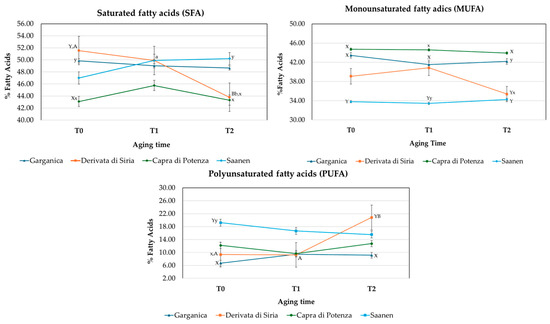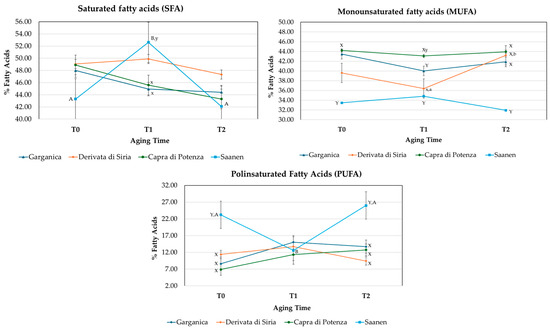 Changes in the content of saturated fatty acids (SFAs), monounsaturated fatty acids (MUFAs), and polyunsaturated fatty acids (PUFAs) during aging time (T0, 0 days; T1, 3 days; and T2, 7 days) in the Longissimus thoracis et lumborum muscle cut from the four groups of kids (GR, Garganica; DS, Derivata di Siria; CP, Capra di Potenza; SA, Saanen). Different lowercase (a,b = p < 0.05) or uppercase (A, B = p < 0.01) letters indicate significant differences among aging times within the same breed. Different lowercase (x, y = p < 0.05) or uppercase letters (X, Y = p < 0.01) indicate significant differences among breeds for the same aging time.