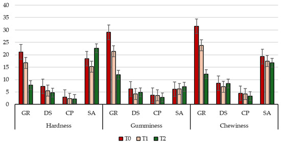 The texture profile analysis (TPA test) and the Warner–Bratzler shear force (WBSF) tests were assessed on raw QF and LTL muscles at all sampling times (T0, T1, and T2) using an EZ-Test texturometer Shimadzu (Shimadzu Corporation, Kyoto, Japan) as reported by Ambrosio et al. [16] and Marrone et al. [21], respectively. Notably, the TPA test provided the following parameters: adhesiveness, hardness, springiness, gumminess, chewiness, and resilience, while the WBSF test measured the shear force (N) as an indicator of meat toughness [22]. The mean values of the cuts were used for the statistical analysis.