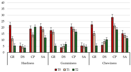Rheological properties of meat, especially hardness, gumminess, chewiness, and elasticity, exert a decisive influence on the consumer’s sensory perception, impacting key quality attributes including tenderness, juiciness, and ease of mastication [81]. Overall, the results obtained from the TPA test analyses, performed on raw goat LTL and QF muscle cut samples belonging to the four different kids’ groups (GR, DS, CP, and SA), highlighted a positive effect of aging on all the tested parameters, particularly hardness, gumminess, and chewiness (Figure 4 and Figure 5). These findings suggest a sensory improvement in meat texture properties as the aging period progresses, which can be attributed to the series of physical and biochemical reactions occurring during the wet ageing process. Among these, the hydrolysis of myofibrillar proteins by endogenous enzymes, such as calpains and cathepsins, is known for releasing small peptides (e.g., carnosine) and free amino acids (FAAs), which contribute to enhanced tenderness and flavor [81]. Concerning the genetic breed effect, data revealed that meat from kids of local genetic types, despite some differences among them, exhibited more favorable rheological characteristics and higher consumer acceptability compared to the selected breed, which was characterized by greater tenderness, homogeneity across muscle cuts, and reduced chewiness. These features make the kids of the local breeds particularly suitable for high-quality traditional productions and for highlighting authentic regional flavors. Specifically, regarding hardness, a key parameter influencing perceived softness [82], a progressively significant (p < 0.01; Table S4) decrease was observed over time in GR and DS kids for both analyzed muscles. CP showed a significant (p < 0.01; Table S4) increase at the end of the aging period in the QF anatomical cut. Conversely, SA exhibited a significant (p < 0.01; Table S4) increase in hardness value in LTL at T2, potentially compromising the final perception of tenderness [83]. The observed increases could be attributed to the marked reduction in muscle tissue water content from T1 to T2 [18], as shown in Table 3. Concerning gumminess and chewiness, both related to the effort required for mastication [82], data showed clear breed-related differences, muscle-specific patterns, and a progressive decline over the aging period. Among groups of kids, GR consistently displayed the highest values for both parameters in both muscles and at all time points, indicating a firmer and more resistant texture. In contrast, DS and CP exhibited markedly lower values, reflecting a more tender structure and, consequently, a potentially more favorable sensory profile. Finally, SA showed intermediate levels, higher than DS and CP but lower than GR, confirming its overall tougher texture compared with the kids of local breeds. Muscle comparison revealed that the LTL muscle cut generally exhibited higher gumminess and chewiness than QF in all groups of kids, except CP, where QF values were significantly (p < 0.01; Table S4) higher than LTL, highlighting a distinctive resistance of the hind leg muscle in this genotype. Over the aging period (T0 to T2), all breeds and muscles experienced a progressive decrease in gumminess and chewiness, indicating effective tenderization during the wet aging [83]. The reduction was particularly pronounced in GR and in the QF of CP, suggesting a strong response to aging despite initially high toughness. Conversely, SA meat showed a less marked decline, especially in the LTL muscle, maintaining relatively high values throughout the aging period and confirming a lower susceptibility to tenderization, which may negatively affect consumer perception of meat palatability [82]. Also, adhesiveness (Table S4), which reflects the meat’s tendency to stick on the palate surface [84], showed significant differences among groups of kids. Local genetic types, particularly GR, exhibited more uniform and generally lower values, indicative of less sticky and more pleasant meat during mastication. Regarding springiness, a texture parameter highly related to intramuscular fat content [85], values remained relatively stable over time and across groups of kids. However, SA meat exhibited significantly lower values (p < 0.01; Table S4), particularly in the LTL muscle, accompanied by a concurrent increase in hardness over the same period (T2), which could potentially compromise the perceived firmness and juiciness during mastication [81]. Finally, concerning resilience (Table S4), which reflects the tissue’s ability to regain its original shape following compression [82], fluctuations were observed in all kids. An interesting exception was noted in CP, where the QF muscle showed a consistent increase over time, indicating that a more compact structure may enhance chewing comfort and cutting of meat [86].