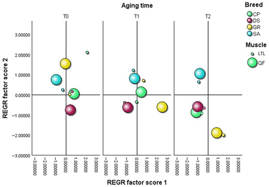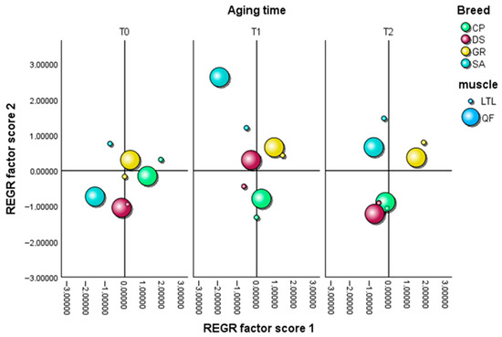 For the sensorial E-nose data, the optimized sensors’ response values obtained from WinMuster software were subjected to principal component analysis (PCA) using the SPSS program to investigate breed-specific as well as muscle cut differences in aromatic profiles and their evolution over aging. In this regard, two separate PCAs were performed: one for the raw meat samples, including both QF and LTL muscles of all breeds and sampling times, and one for the cooked samples, analyzed under the same conditions.