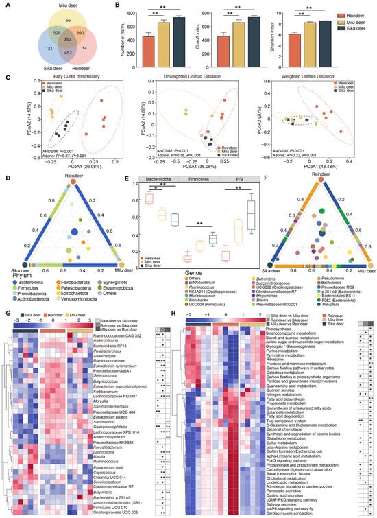 Rumen bacterial community composition and predicted functional profiles. (A) Venn diagram showing shared and unique bacterial ASVs among Sika deer, Reindeer, and Milu deer. (B) Comparison of alpha diversity indices of the rumen microbiota among the three species. (C) PCoA plots based on Bray–Curtis dissimilarity, unweighted UniFrac, and weighted UniFrac distances at the ASV level. The colored dashed ellipses indicate the 95% confidence intervals for each group. (D) Ternary plot displaying the average relative abundance of the top ten bacterial phyla. The three vertices represent the three species. Inner circles represent bacterial phyla, with size proportional to abundance. Proximity to a vertex indicates higher abundance of that phylum in the corresponding species. The colors of three triangle sides and inner circles represent different bacterial phyla as defined in the legend. (E) Comparison of the relative abundances of Bacteroidota and Firmicutes, and F/B ratio among the three species. (F) Average relative abundance of the top twenty bacterial genera among the three species. The colors of three triangle sides and inner circles represent different bacterial genera as defined in the legend. (G) Heatmap showing differentially abundant genera among the three species. The color scale represents normalized relative abundance, ranging from low (blue) to high (red). (H) Heatmap showing differentially enriched KEGG pathways (Level 3) among the three species. * p < 0.05, ** p < 0.01.