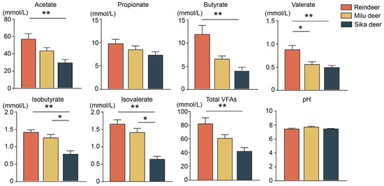 Comparison of fermentation parameters in the rumen fluid among Reindeer, Milu deer, and Sika deer. * p < 0.05, ** p < 0.01.