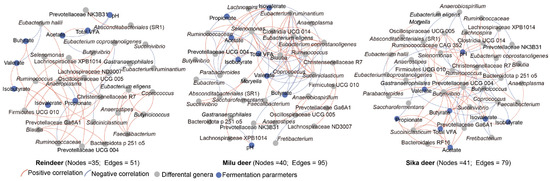 Network analysis was performed to evaluate the associations between differential bacterial genera and fermentation parameters (Figure 3). The resulting correlation networks exhibited distinct topological structures for each species: Sika deer (41 nodes, 79 edges), Reindeer (35 nodes, 51 edges), and Milu deer (40 nodes, 95 edges). Notably, the Milu deer network displayed the highest average degree of connectivity, whereas the Reindeer network was the least complex.