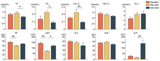 Comparison of serum biochemical parameters among Reindeer, Milu deer, and Sika deer. * p < 0.05, ** p < 0.01.