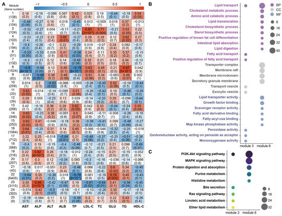 WGCNA identifying associations between blood DEGs and serum biochemical parameters. (A) Heatmap displaying correlation coefficients between 25 co-expression modules (rows) and 13 serum biochemical parameters (columns). In each cell, the upper value represents the correlation coefficient, and the lower value represents the corresponding significance level (p-value). The color gradient ranges from blue (negative correlation) to red (positive correlation), with intensity reflecting the strength of the correlation. (B) GO enrichment analysis of genes within Modules 3 and 8. Dot size is proportional to the number of genes annotated to each GO term, while dot color denotes the GO category: Biological Process (BP, purple), Cellular Component (CC, grey), and Molecular Function (MF, blue). (C) KEGG pathway enrichment analysis for Modules 3 and 8. Dot size reflects the number of genes enriched in each pathway. Dot color indicates statistical significance, ranging from yellow (lower significance) to dark purple (higher significance).