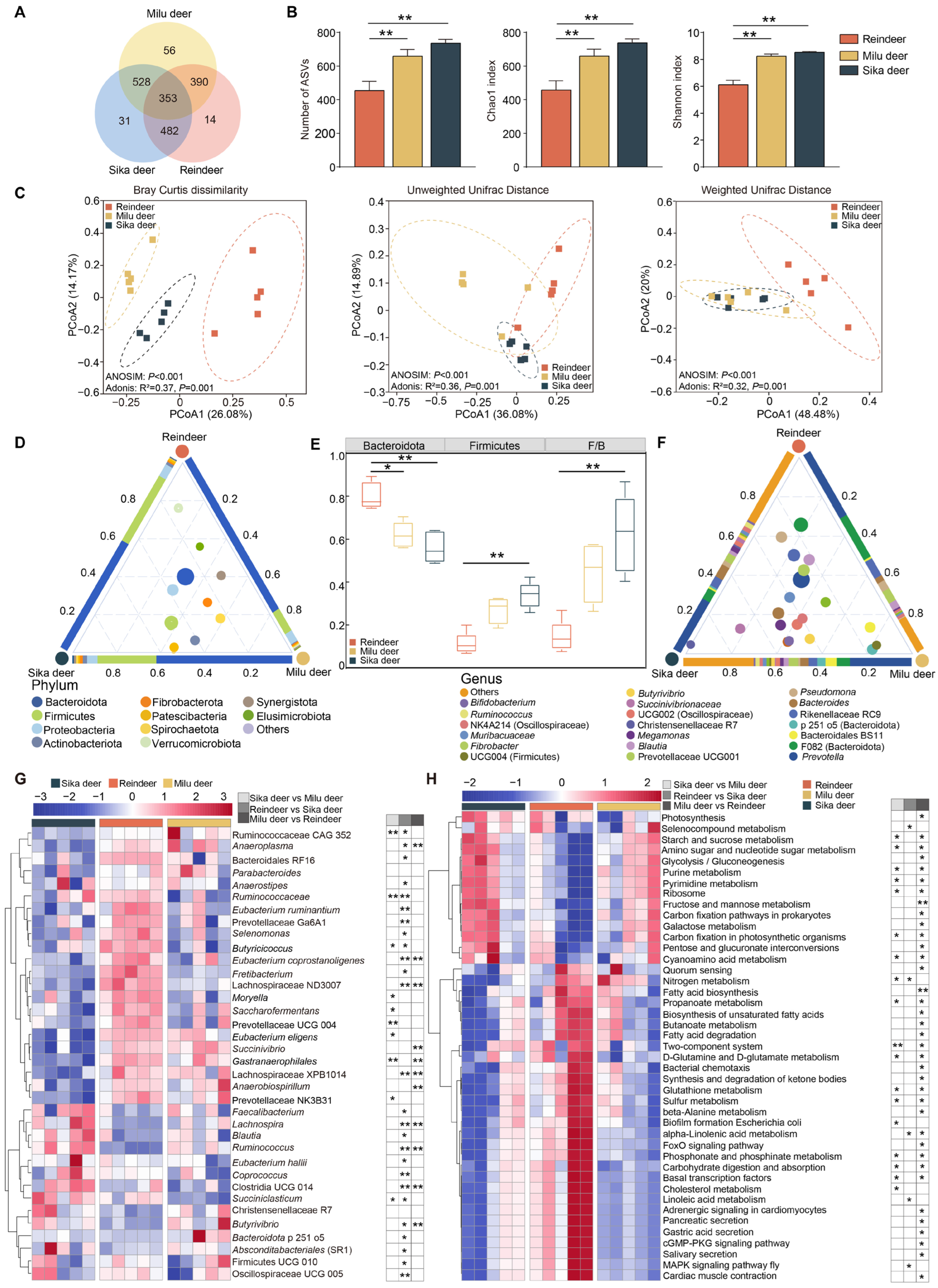 3.1. Comparison of Rumen Microbiota and Potential Functions Among Sika Deer, Reindeer, and Milu Deer