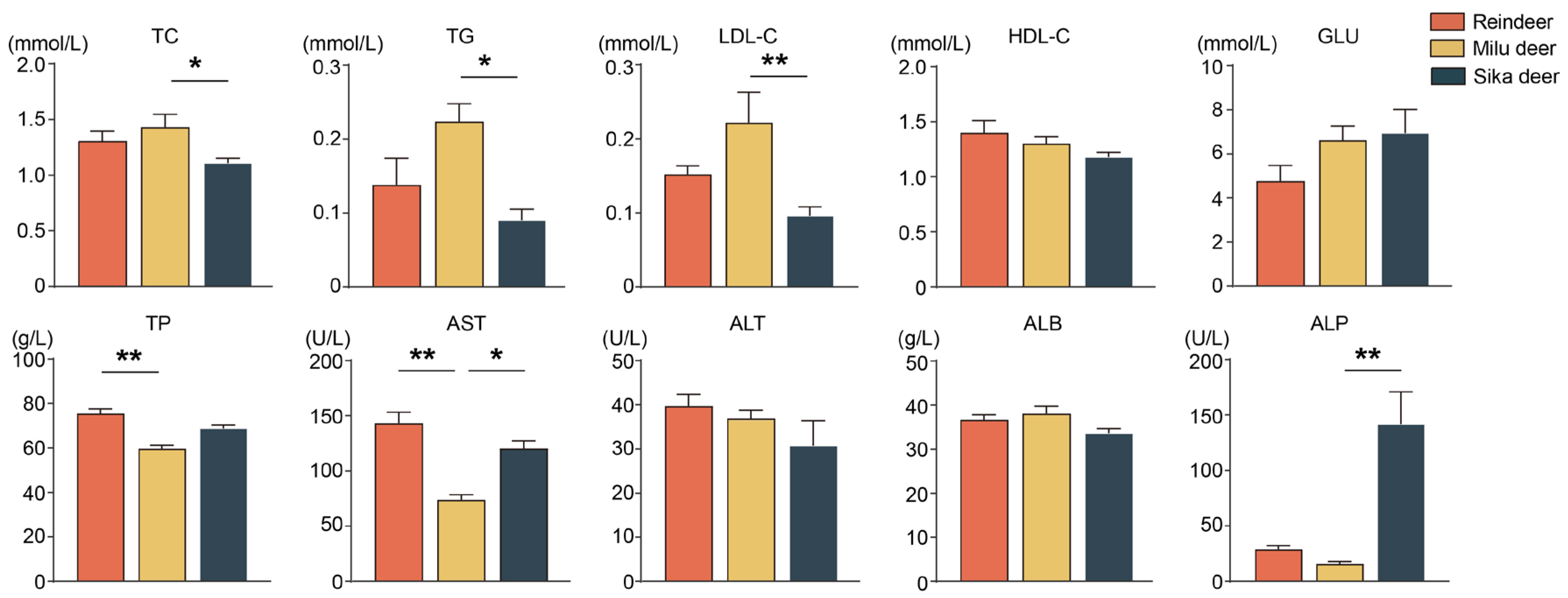 3.4. Comparison of Serum Biochemical Parameters Among the Three Cervid Species