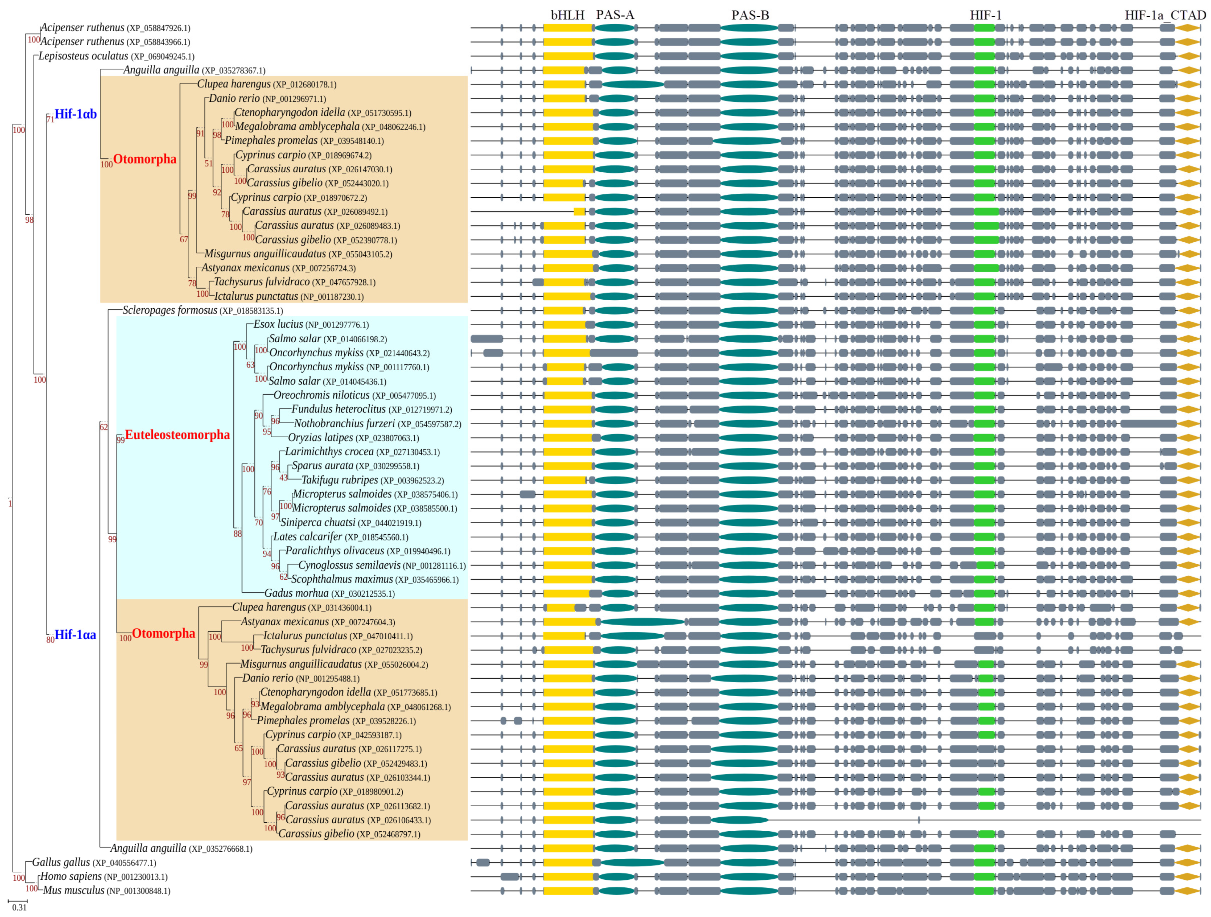 - Townley, I.K.; Babin, C.H.; Murphy, T.E.; Summa, C.M.; Rees, B.B. Genomic analysis of hypoxia inducible factor alpha in ray-finned fishes reveals missing ohnologs and evidence of widespread positive selection. Sci. Rep. 2022, 12, 22312. [Google Scholar] [CrossRef]