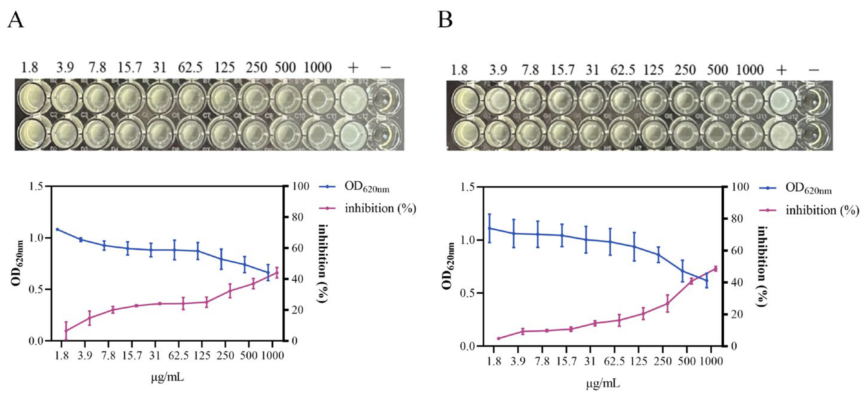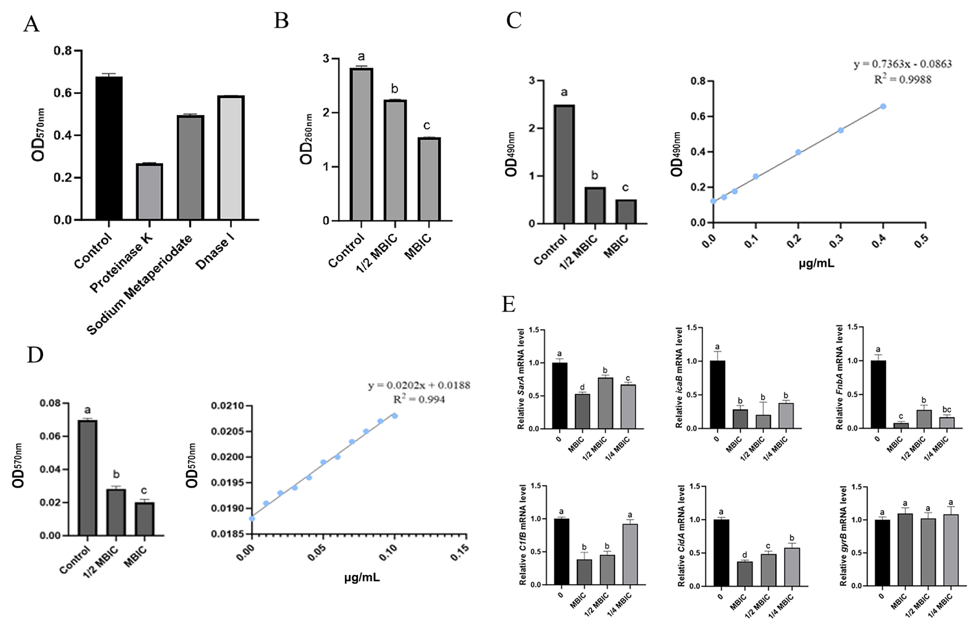 3.9. MmEV-Mediated Inhibition of Biofilm Extracellular Components and Gene Expression