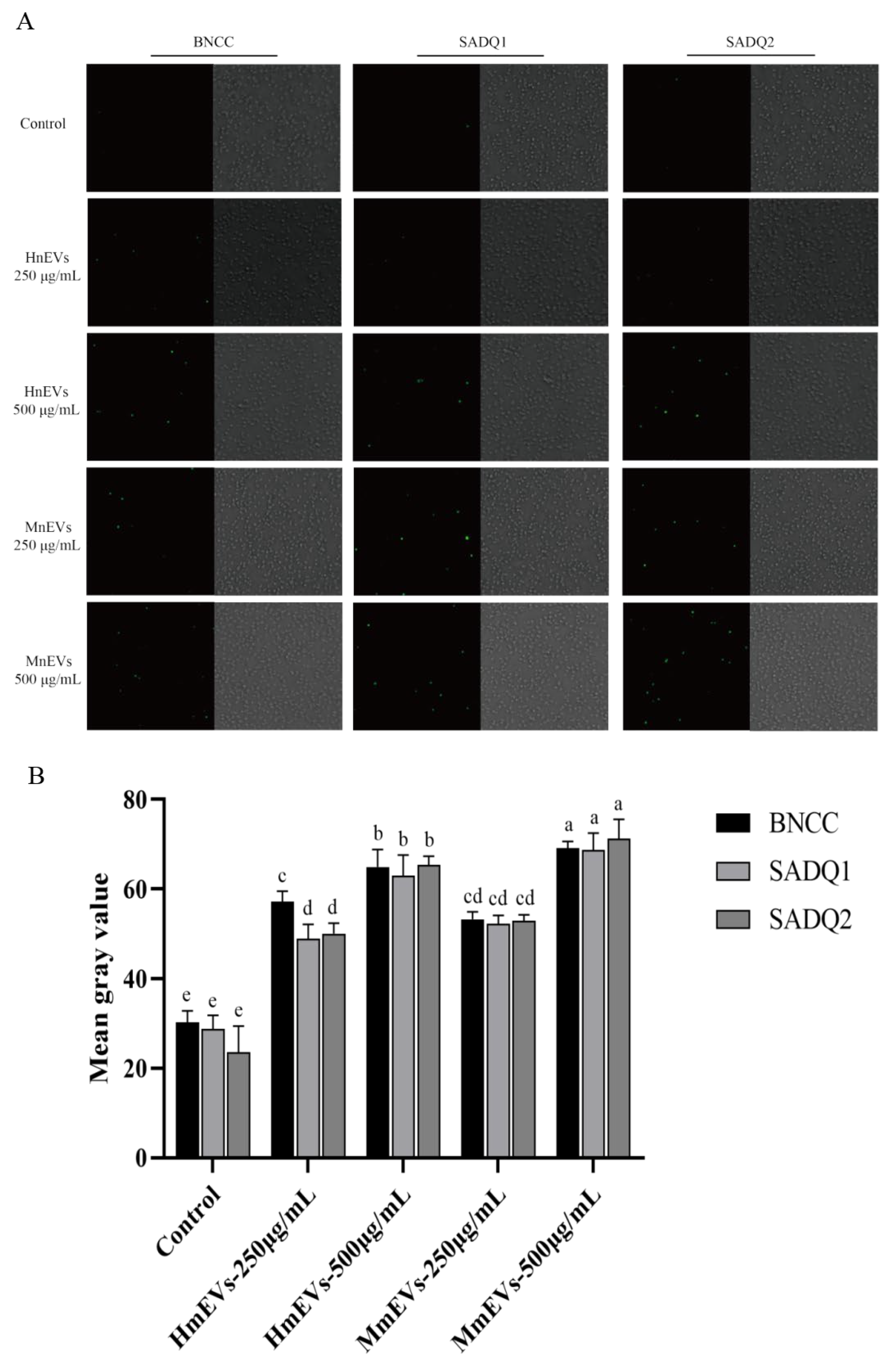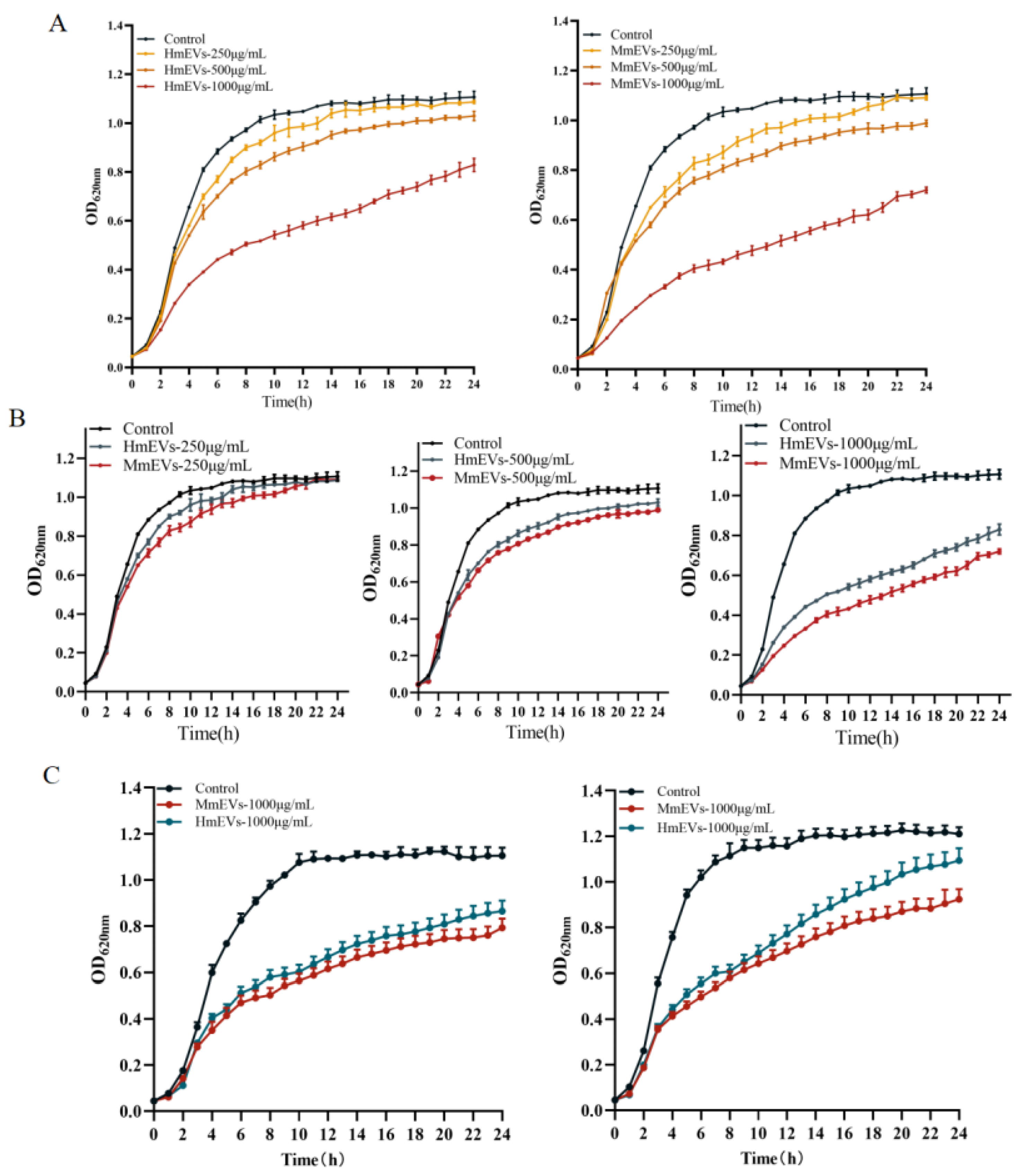 3.4. Growth Inhibition of S. aureus by HmEVs and MmEVs