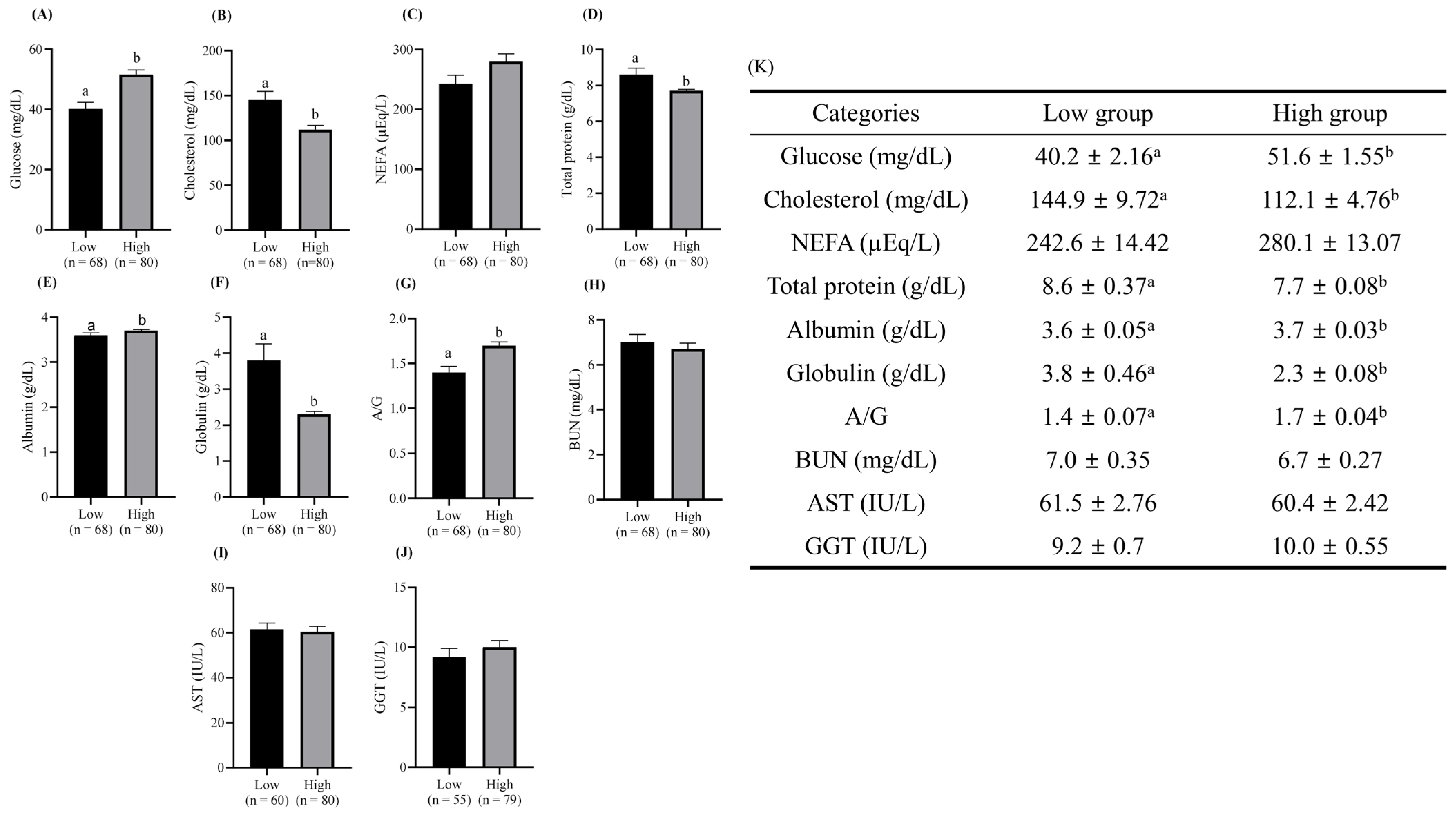 | Farms | No. of Blood Samples Collected | Glucose (mg/dL) | Cholesterol (mg/dL) | NEFA (µEq/L) 1 | Total Protein (g/dL) | Albumin (g/dL) | Globulin (g/dL) | A/G 2 | BUN (mg/dL) 3 | AST (IU/L) 4 | GGT (IU/L) 5 |