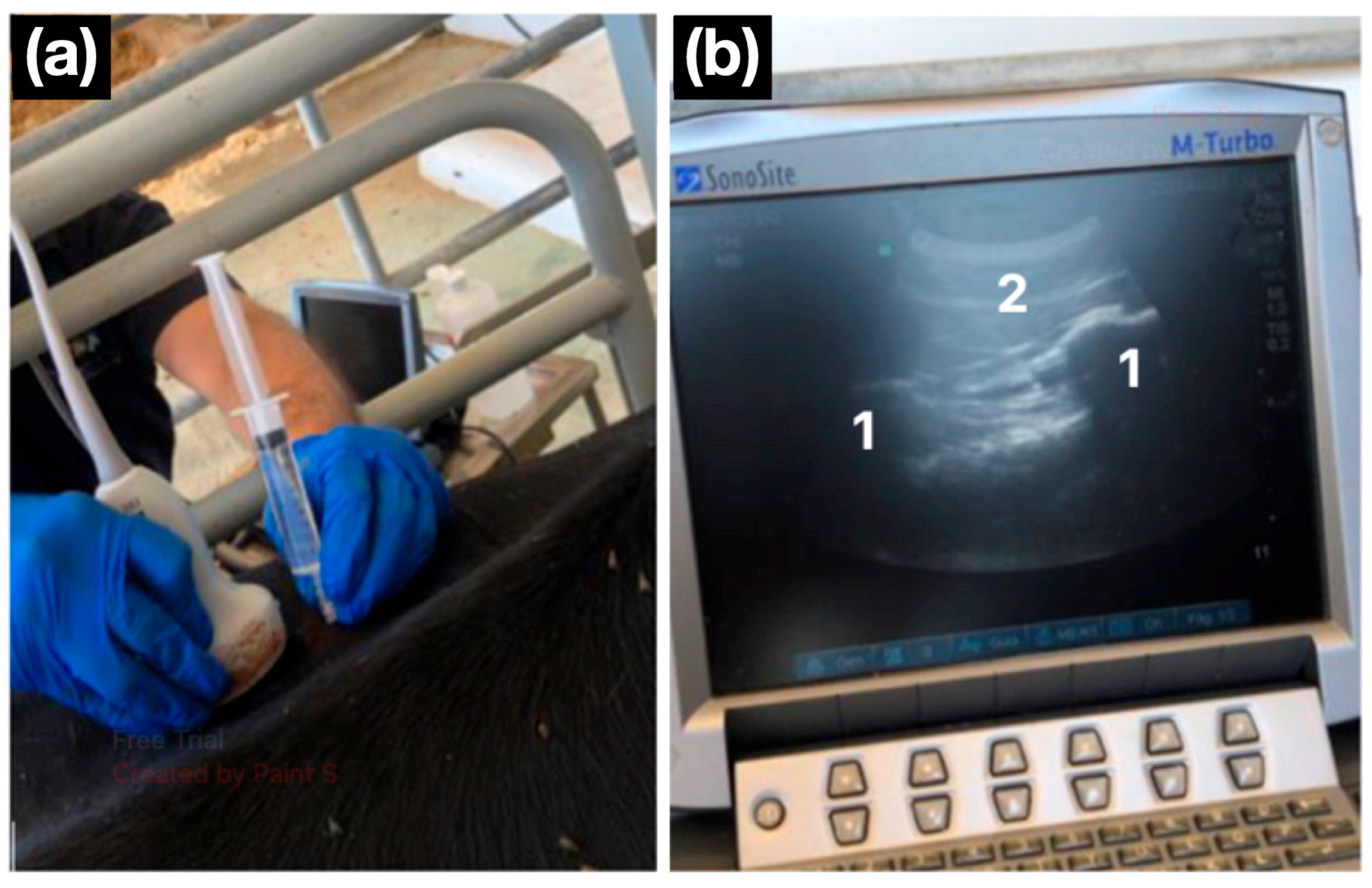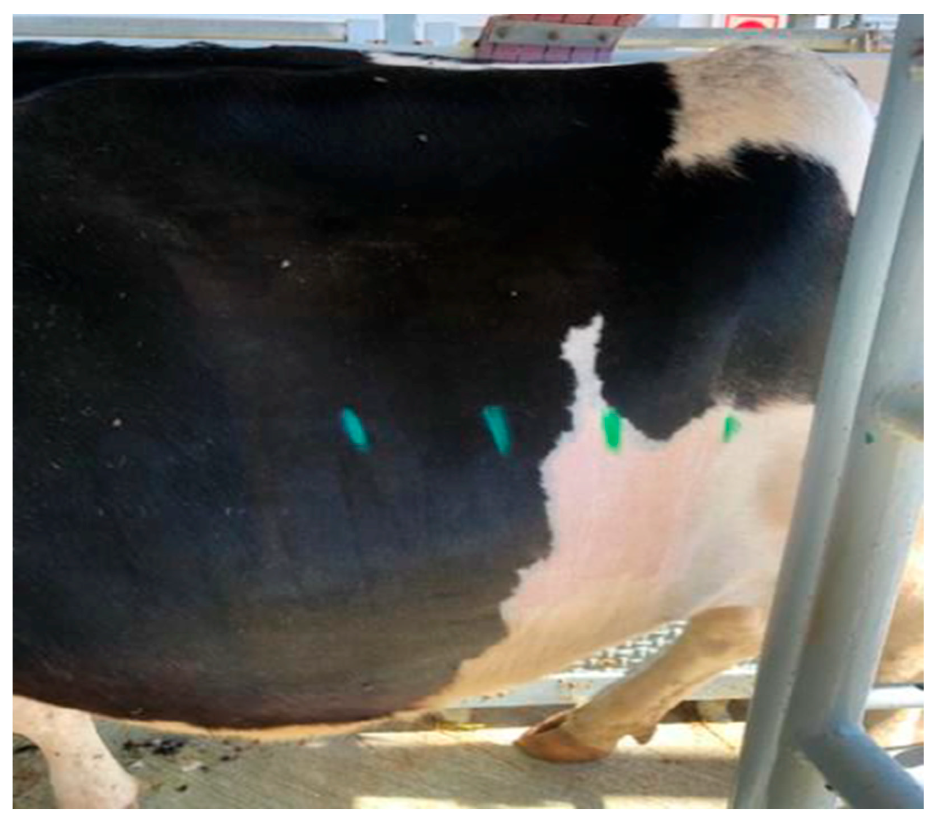 23] were followed to ensure that all relevant information was included and that all stages of the study were conducted appropriately. Twelve healthy adult Holstein cows were enrolled. Animals were acclimated to handling and the experimental environment for one week before the procedure. Body condition score (BCS) was evaluated using a 5-point scale, where 1 indicates very thin and 5 indicates obese. Cows exhibiting signs of agitation, lameness, or systemic illness were excluded.