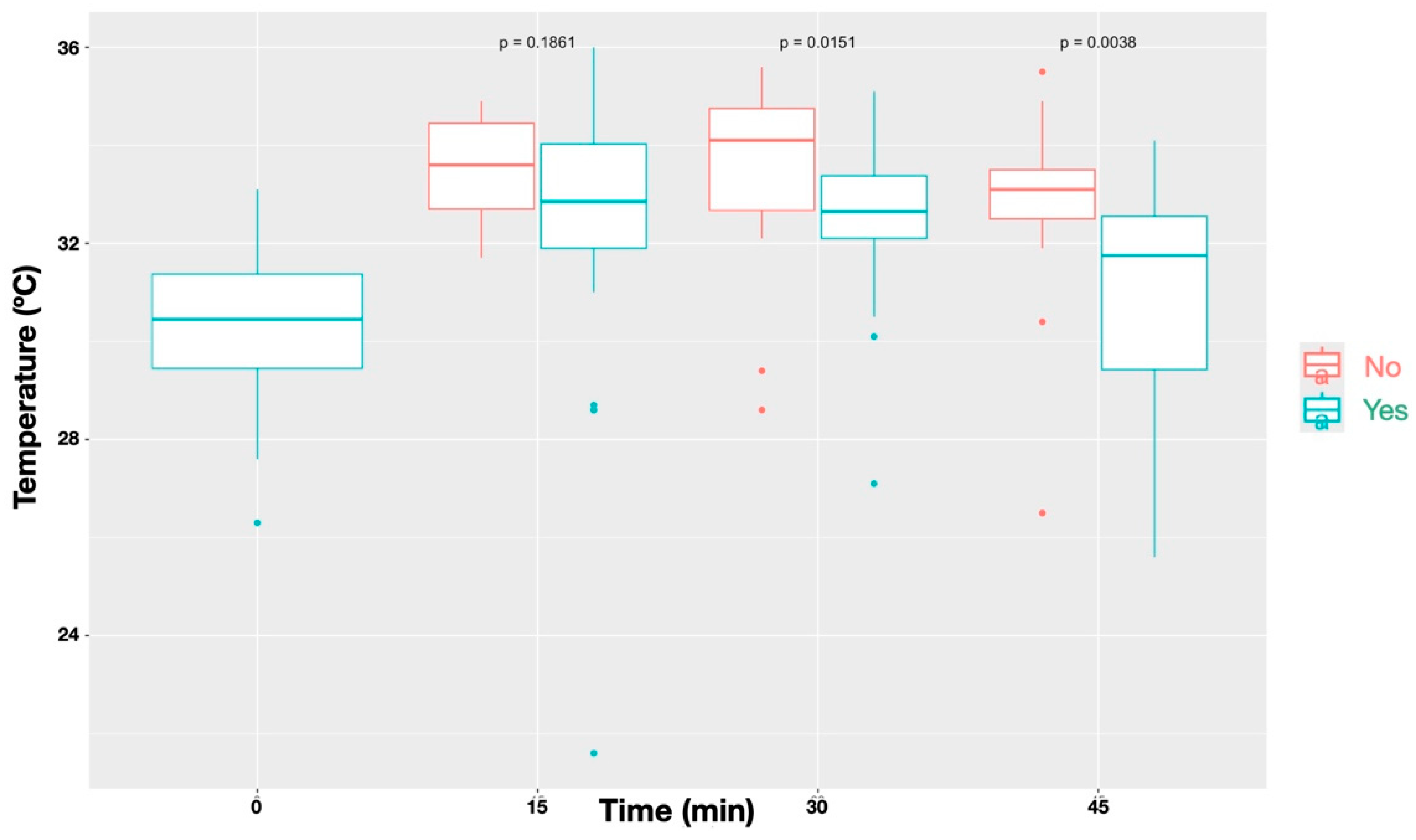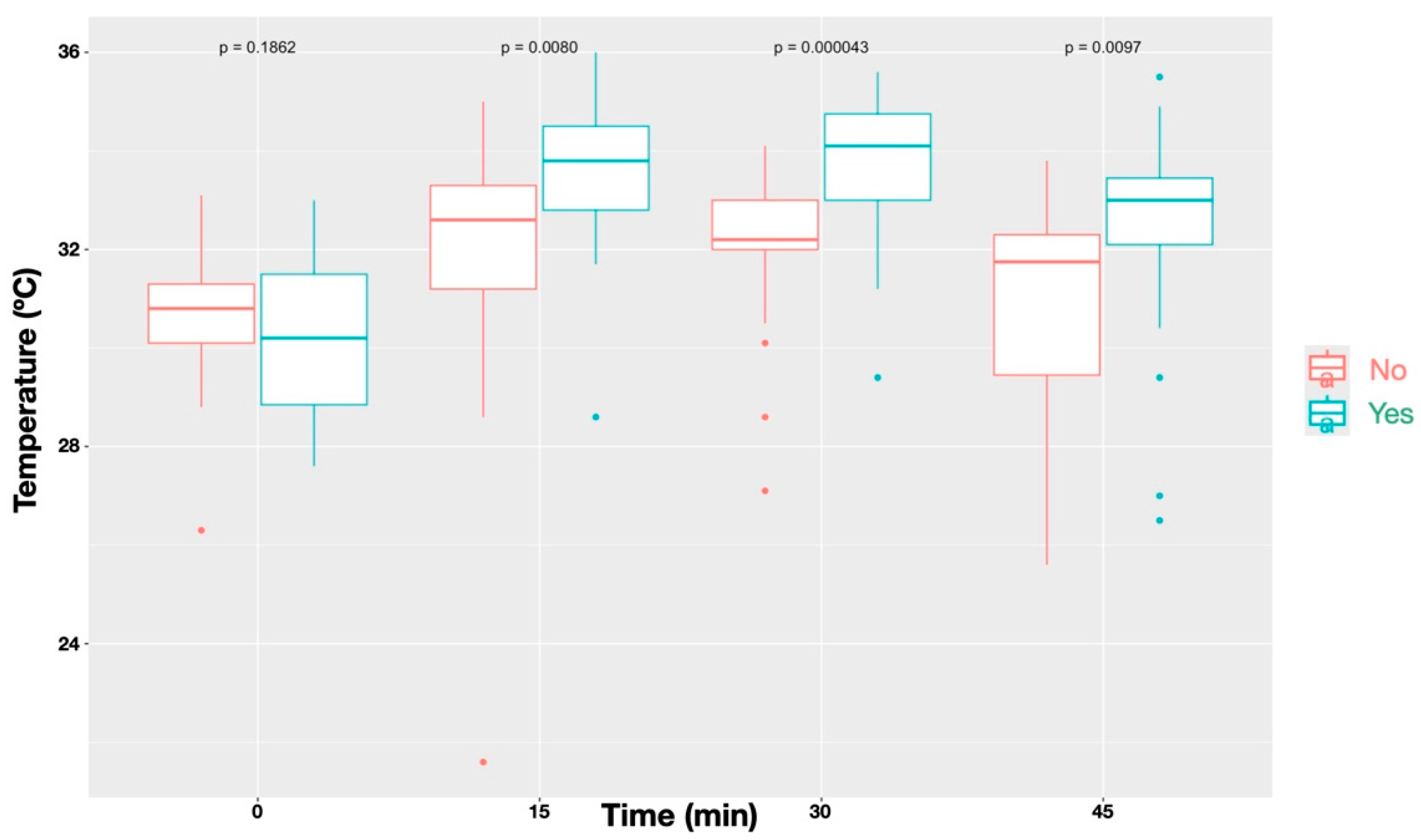 At the contralateral thoracic control site, no significant differences in temperature were found between the different time points (p = 0.076). The recorded temperatures were 26.0 °C [24.3–33.3] (T0), 27.8 °C [25.0–33.0] (T15), 26.3 °C [24.9–35.3] (T30) and 26.4 °C [25.3–33.6] (T45), indicating a transient peak at T15.