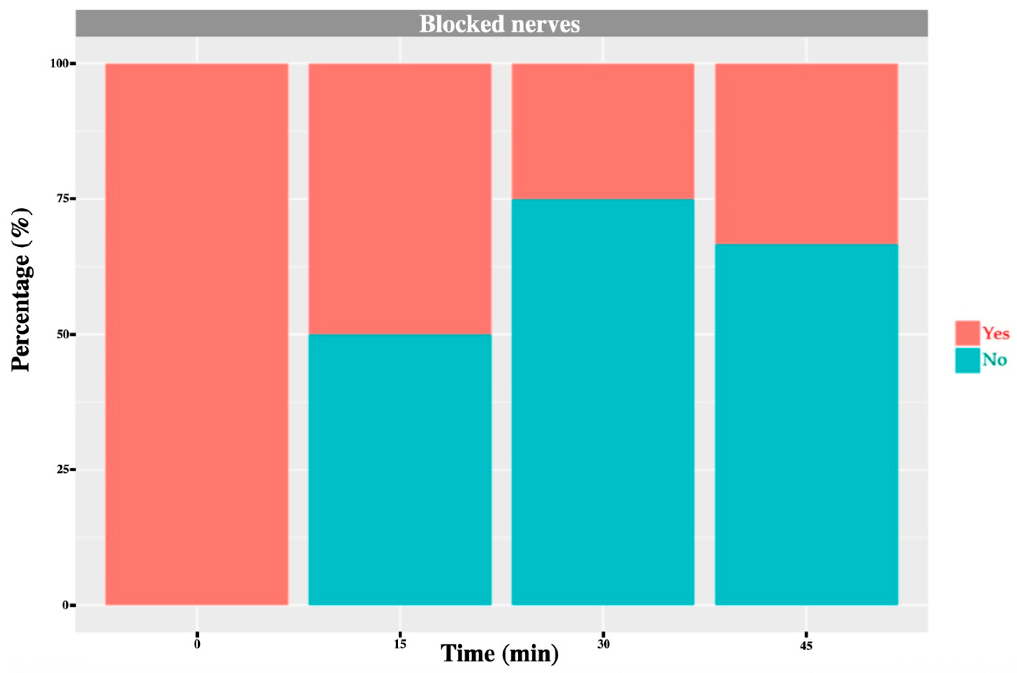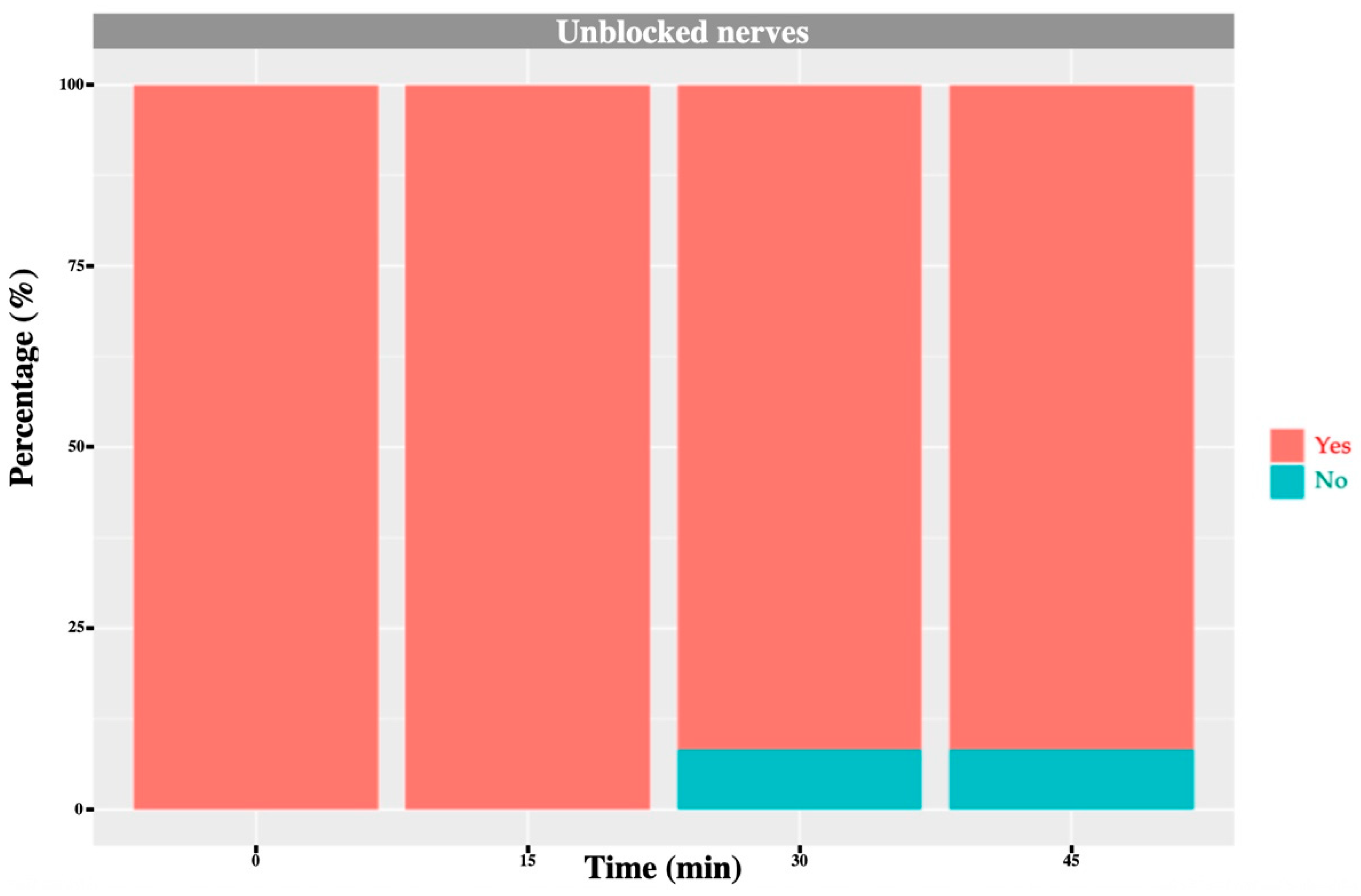 17] used bupivacaine, which has a latency of approximately 20 min, whereas outcome measurements were taken 2–11 min after injection, potentially preceding full onset. Moreover, those authors acknowledged as a limitation that block success was inferred from lack of intraoperative nociception under general anaesthesia while animals also received potent systemic analgesics, conditions under which a nociceptive response might be absent despite an incomplete block. The longer observation interval (15–45 min) and the use of lidocaine in our study, with a faster onset, may explain the more consistent association observed. Interestingly, although there was a tendency for blocked animals to exhibit higher temperatures during the haemostat pinch test, this difference was not statistically significant at 15 min but became significant at 30 and 45 min. This may be explained by the fact that some nerves required a longer time to achieve complete blockade, potentially due to a greater distance between the site of local anaesthetic deposition and the target nerve.