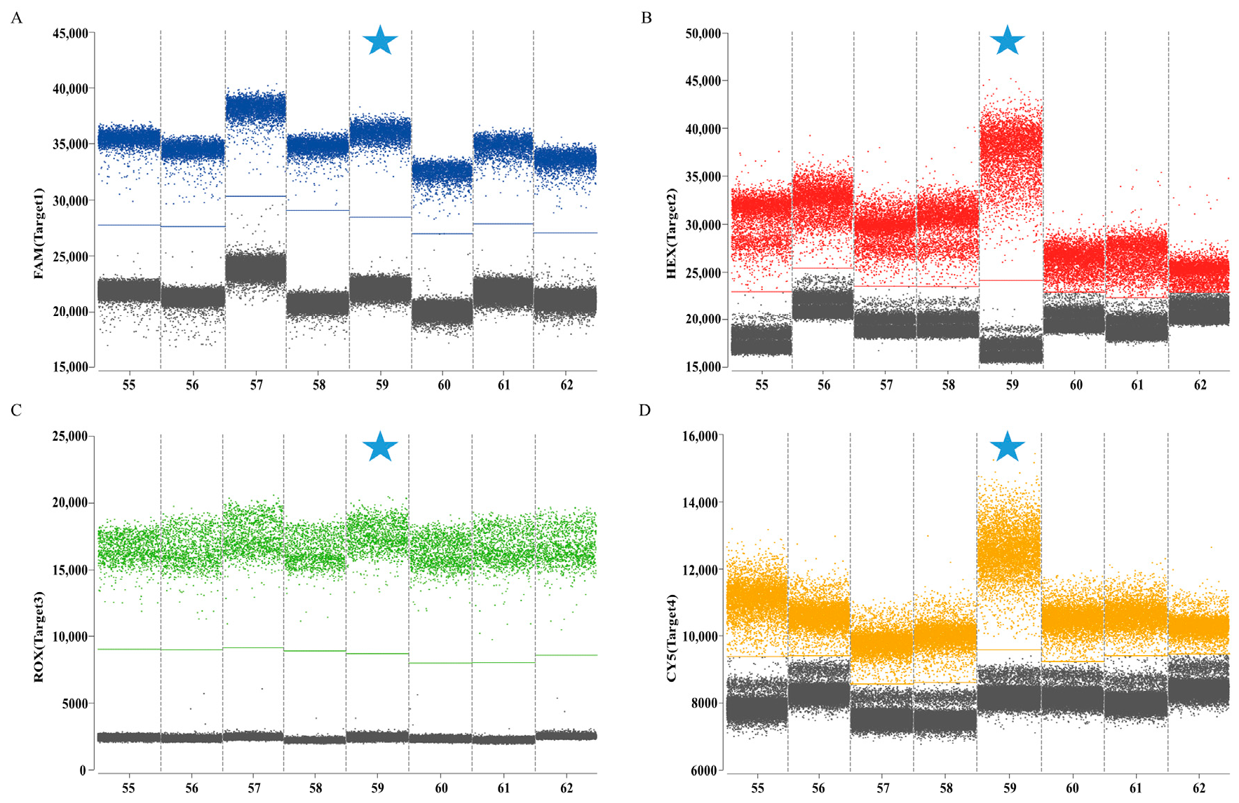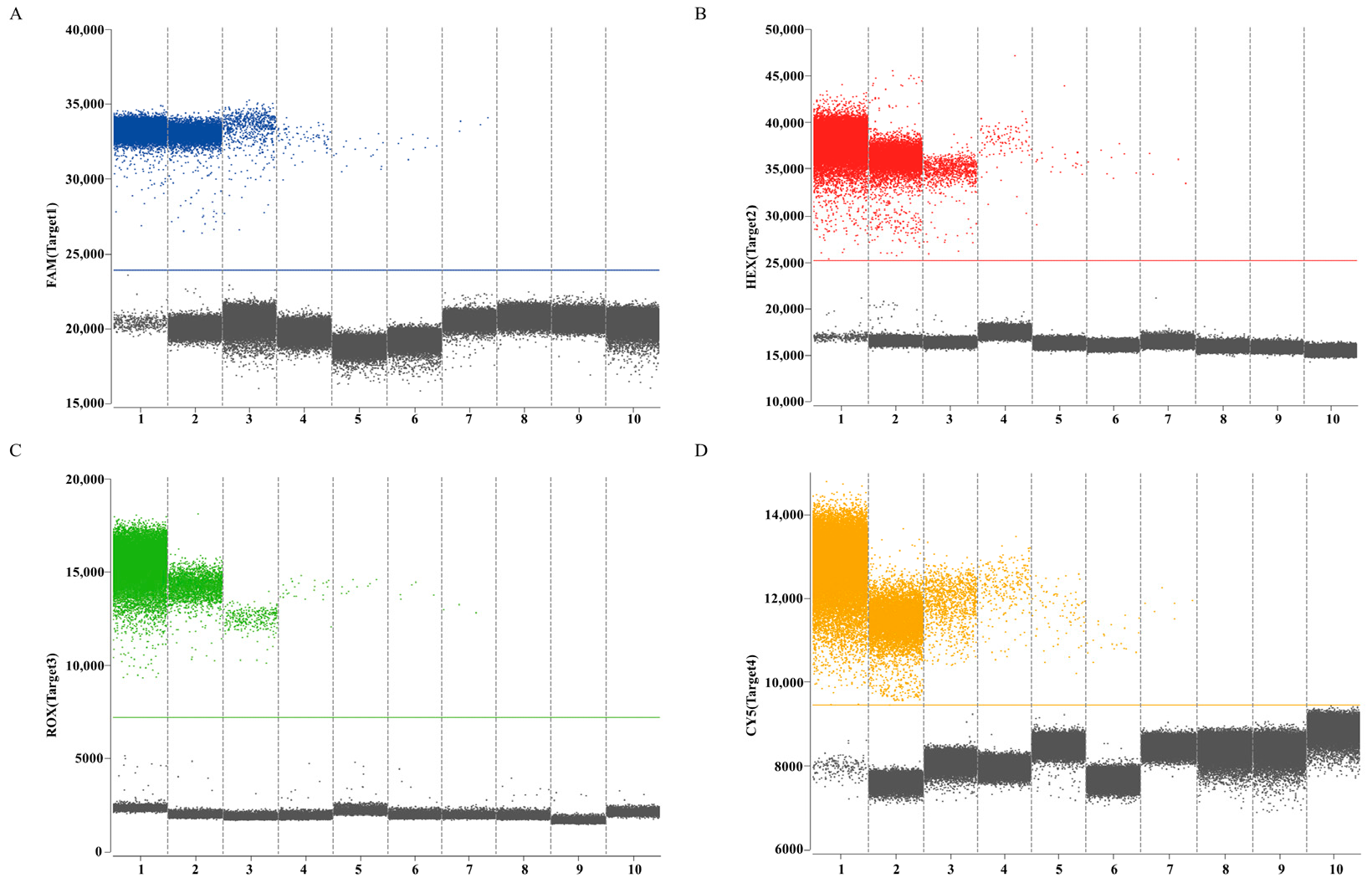 2.6. Optimization of Reaction Conditions for Establishing the Quadruplex DdPCR