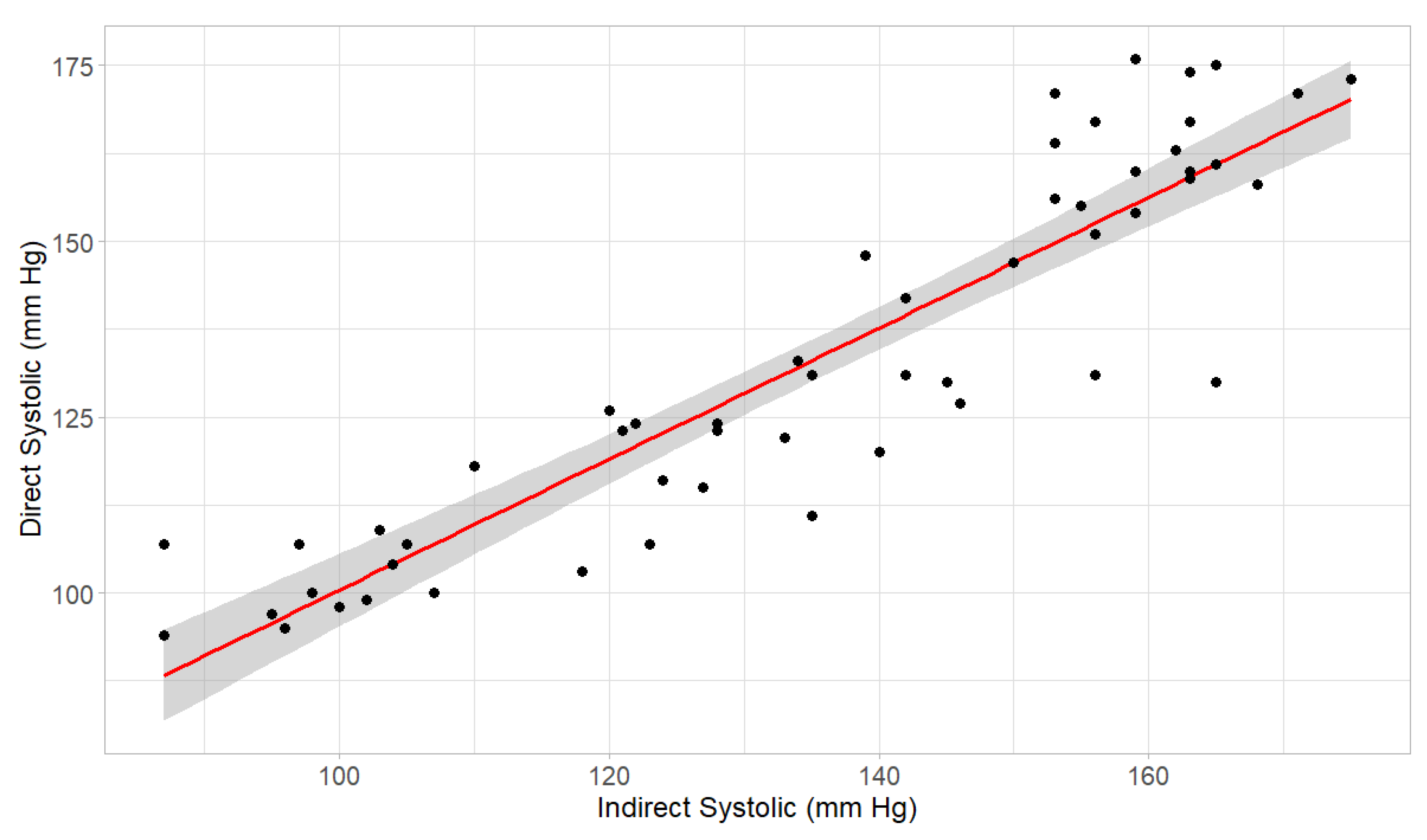 Pearson correlation coefficient of systolic blood pressure measurements was calculated using direct and indirect values pooled from nine bears (