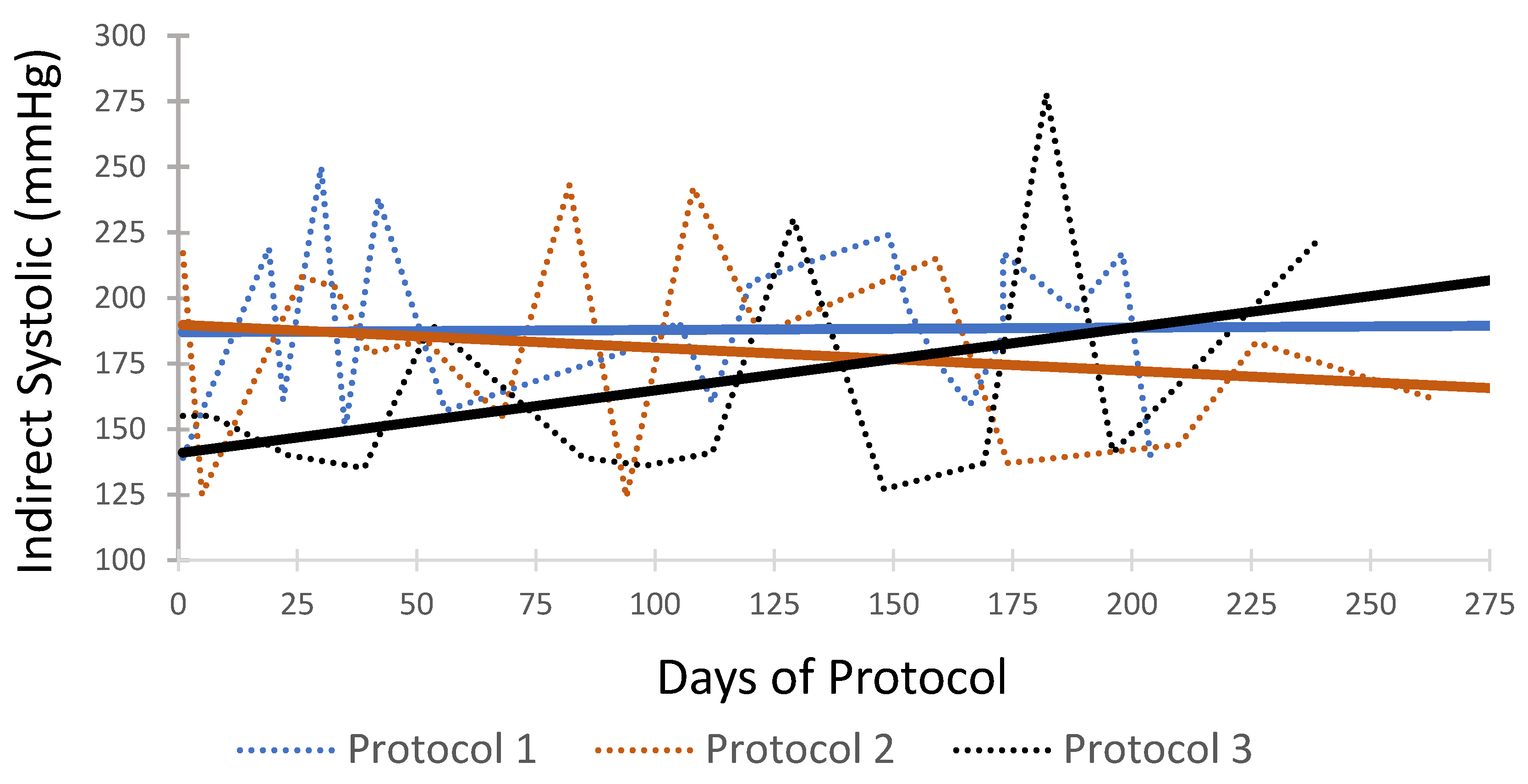 Figure 5). Protocol 1 displayed a relatively constant trendline. In Protocol 2, dosages of antihypertensive medications, enalapril and atenolol, were increased due to the progression of lesions identified at an anesthetized health check. This change in dosage of medication resulted in a decreasing trendline. The antihypertensive drug, amlodipine, was discontinued in Protocol 3 due to adverse effects. In Protocol 3, there is an increasing trendline after eliminating one of the antihypertensive medications. Noting this response, the veterinary team is alerted to make additional medication adjustments. Antihypertensive treatment should be based on the trends of individual patients’ response, and it is hoped that this information will allow veterinarians to modify individual treatment protocols earlier in treatment to minimize the secondary organ damage resulting from systemic hypertension.