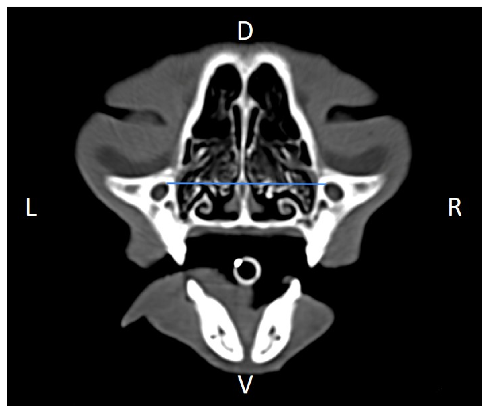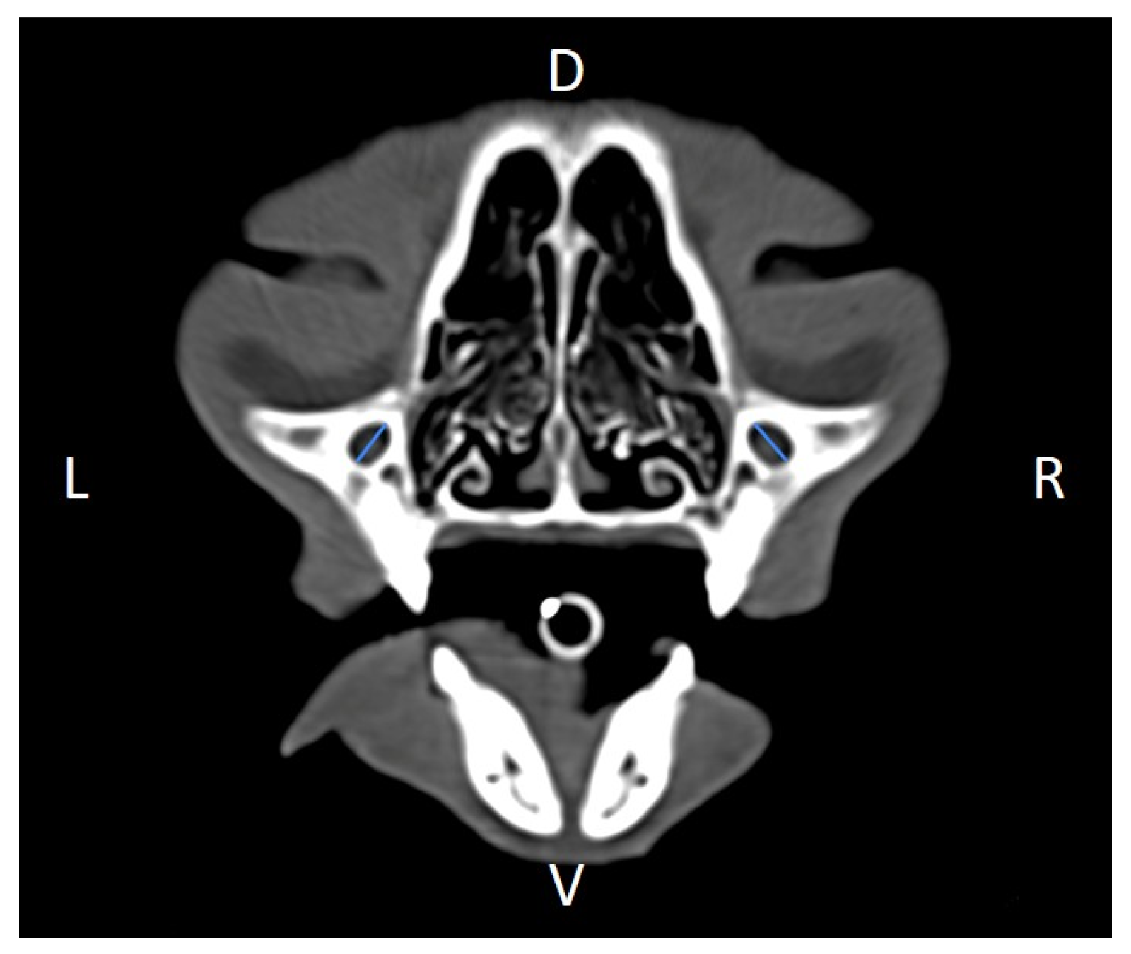 Regarding the imaging protocol, CT scans were performed with a 16-slice helical scanner (Aquilion Prime SP, Canon, Otawara, Japan). Cats were positioned in ventral recumbency with their head aligned and immobilized. Transverse slices of the head were acquired at ~120 kVp, 120 mAs, with a slice thickness of 1 mm, and a slice interval of 0.8 mm. Data was stored in the Digital Imaging and Communications in Medicine (DICOM) format.