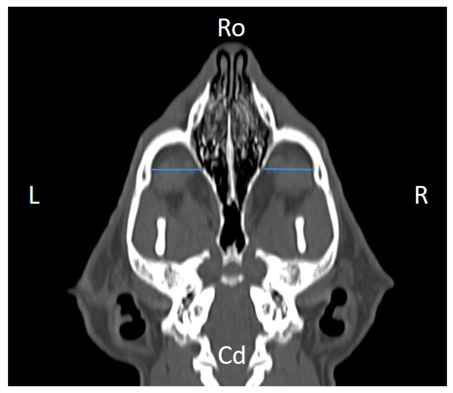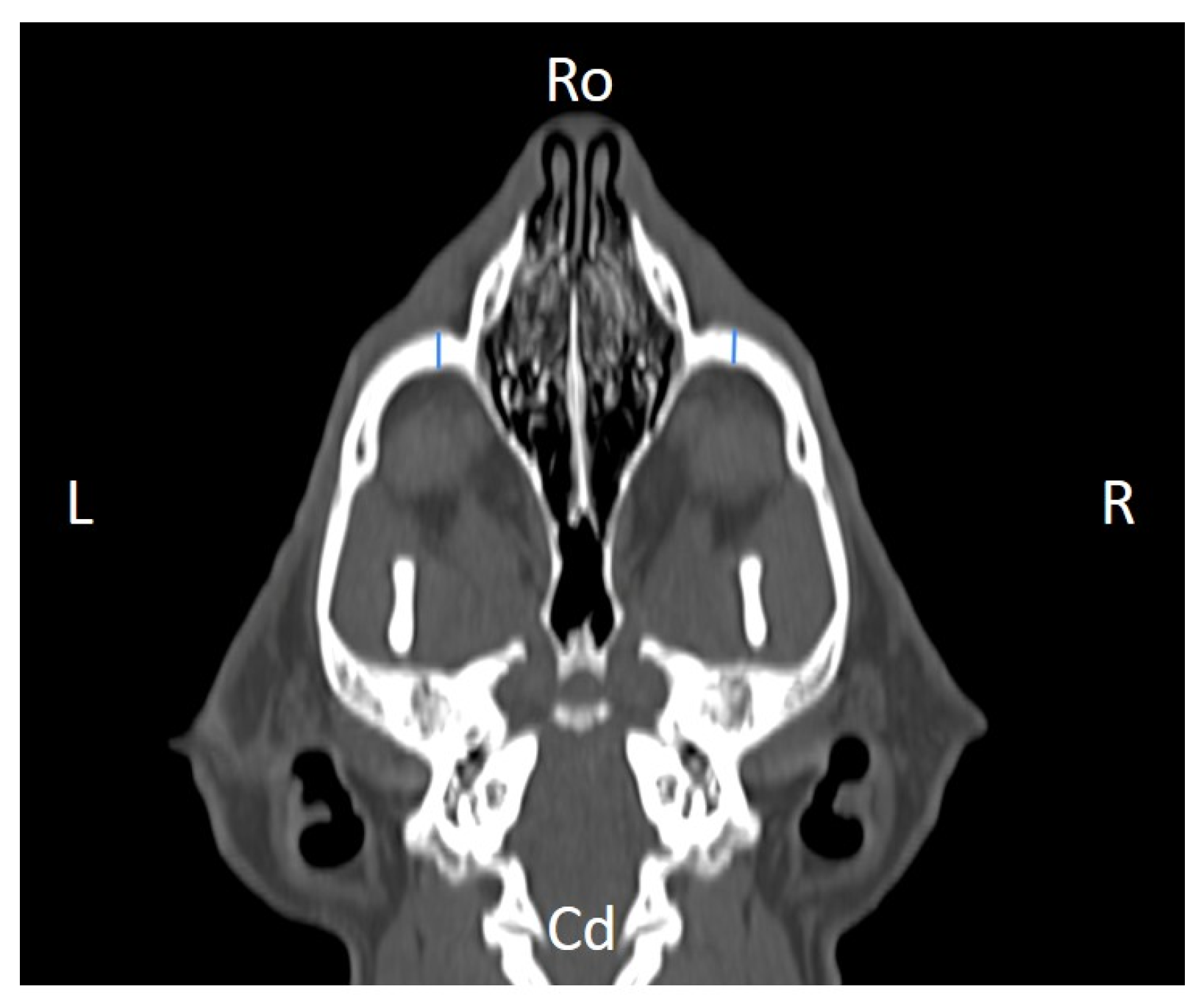 The available literature addressing the orbital and infraorbital regions in the cat remains limited, particularly with respect to detailed morphometric characterization based on imaging studies. As a result, reference data for this anatomical area are still scarce, which may constrain direct comparisons across studies. Within this context, despite the relatively small sample size (