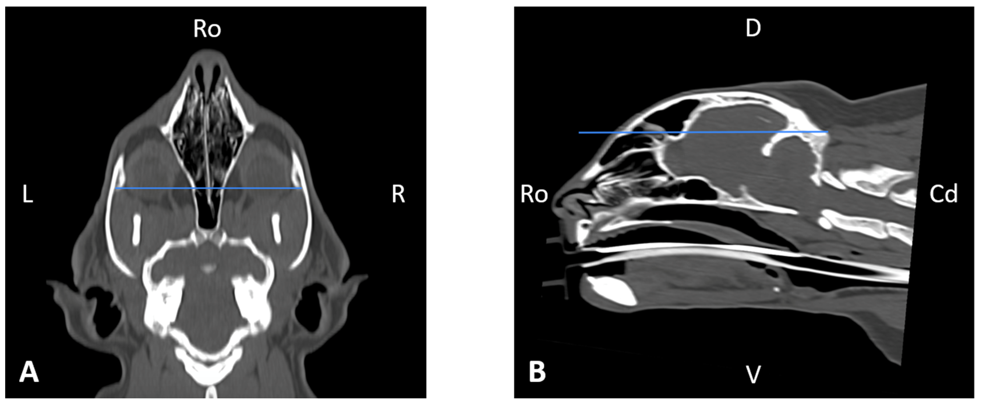 Overall, this study contributes imaging-based anatomical reference data for the feline infraorbital region and demonstrates that simplified CT-derived measurements can provide clinically relevant information, supporting safer and more informed application of locoregional anesthetic and surgical techniques in cats.