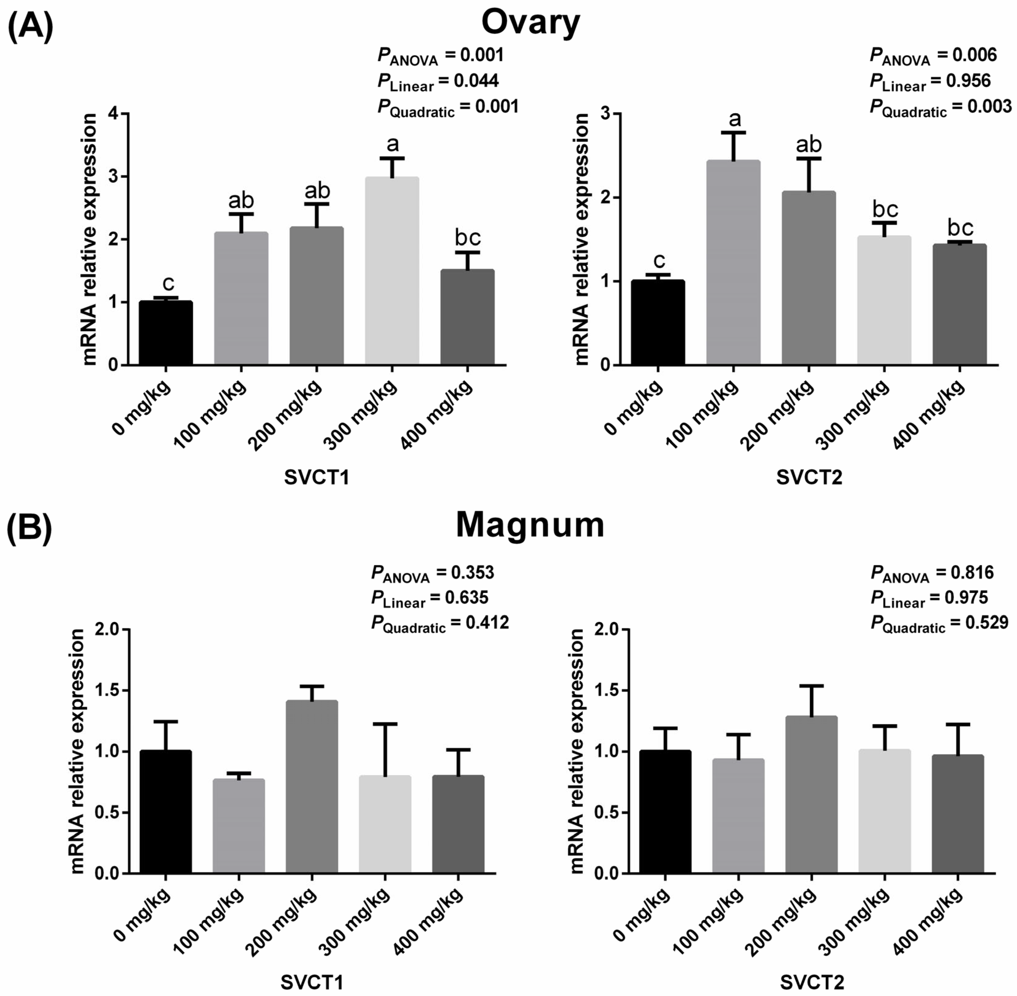 3.3. Ovarian and Magnum Expressions of SVCT1 and SVCT2 Related to Vitamin C Transport