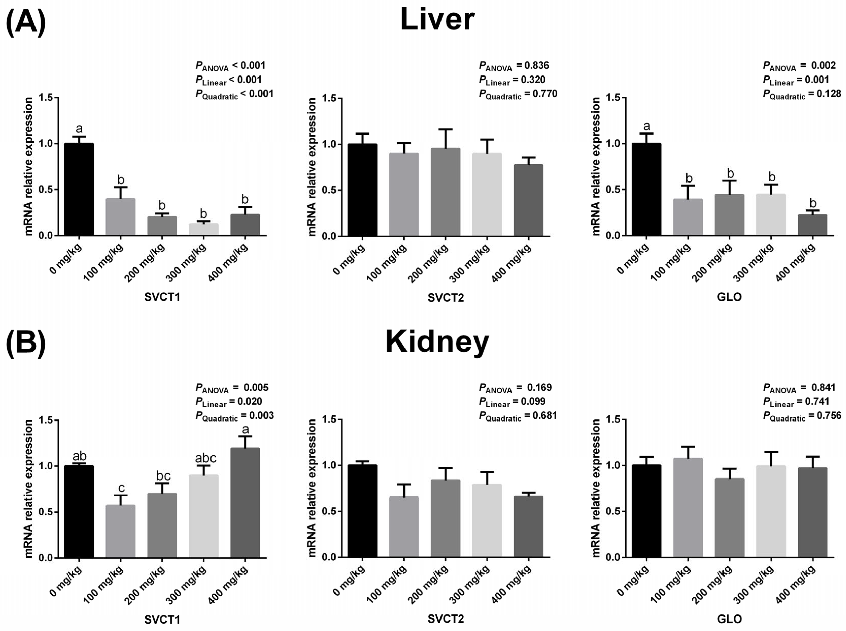 3.4. Hepatic and Renal Expressions of GLO, SVCT1, and SVCT2 Related to Vitamin C Synthesis