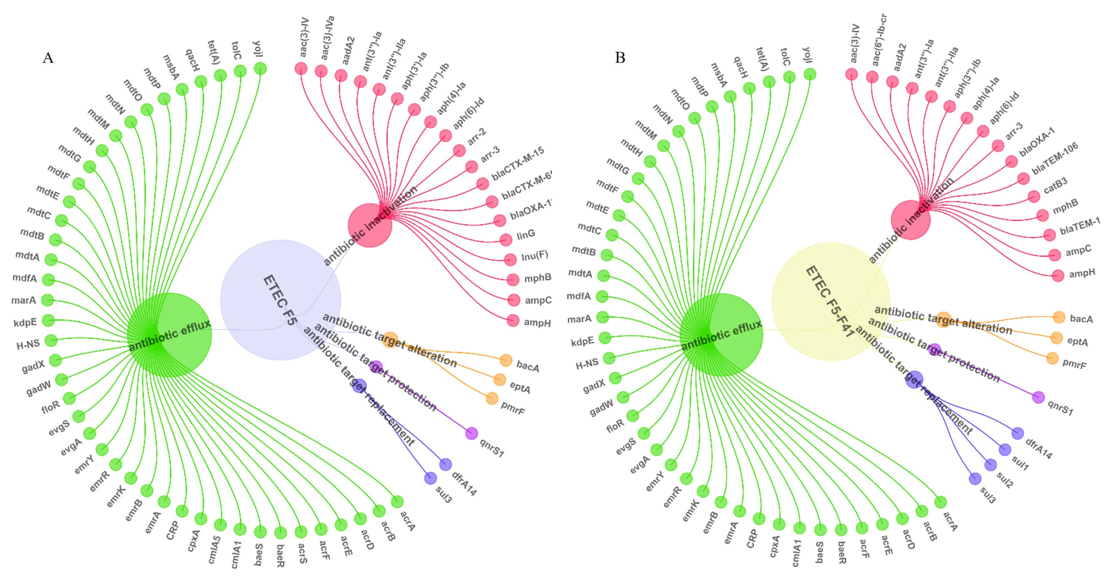 | ETEC F5 | β-lactamase | blaCTX-M-15 blaCTX-M-65 blaOXA-10 ampC ampH | AMP CRO CAZ ATM |