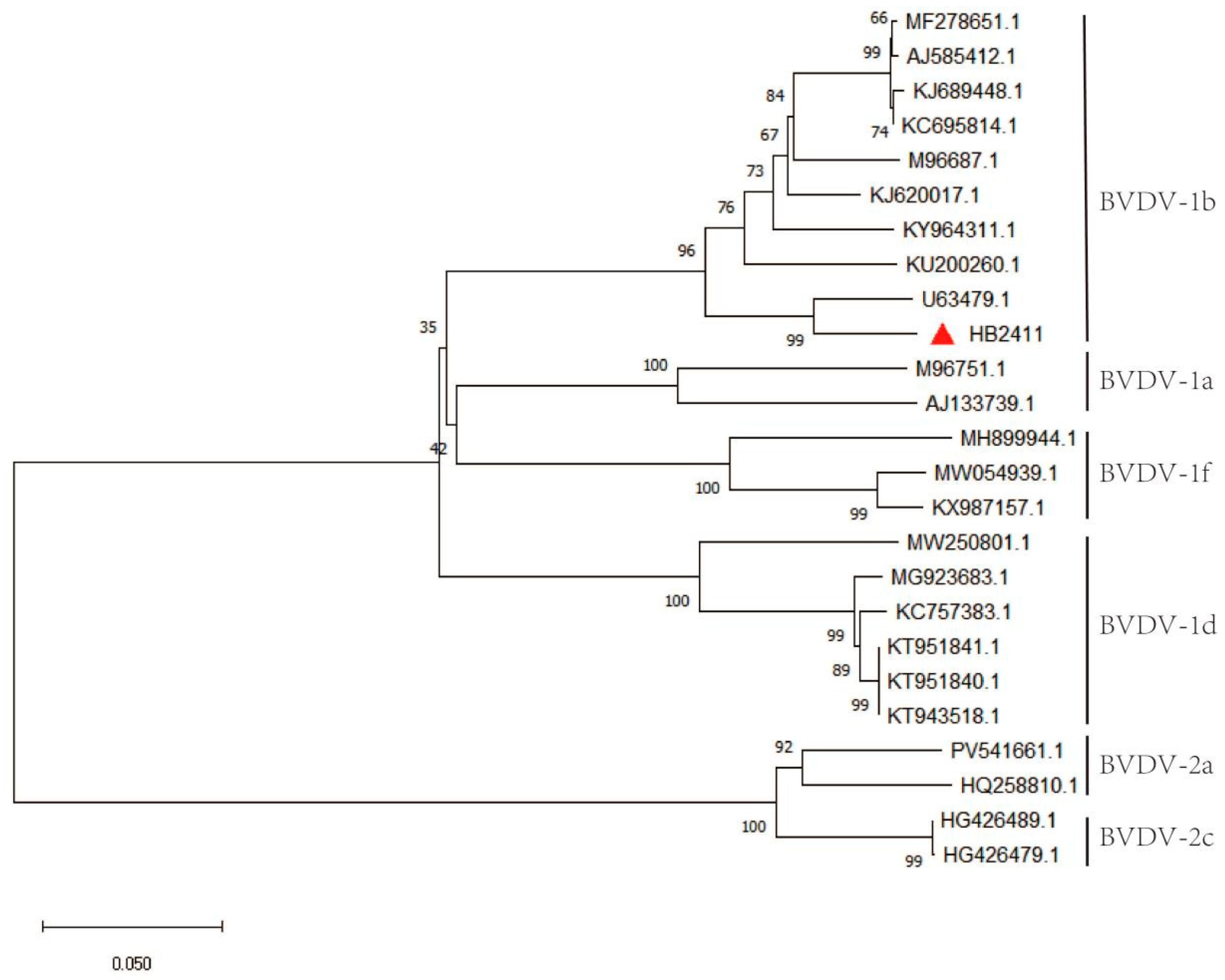 6]. BVDV exhibits high genetic diversity. Based on partial gene or genome sequences, BVDV can be classified into BVDV1, BVDV2, and the newly emerged HoBi-like virus (BVDV3). The main circulating strains in China belong predominantly to the BVDV1 type [