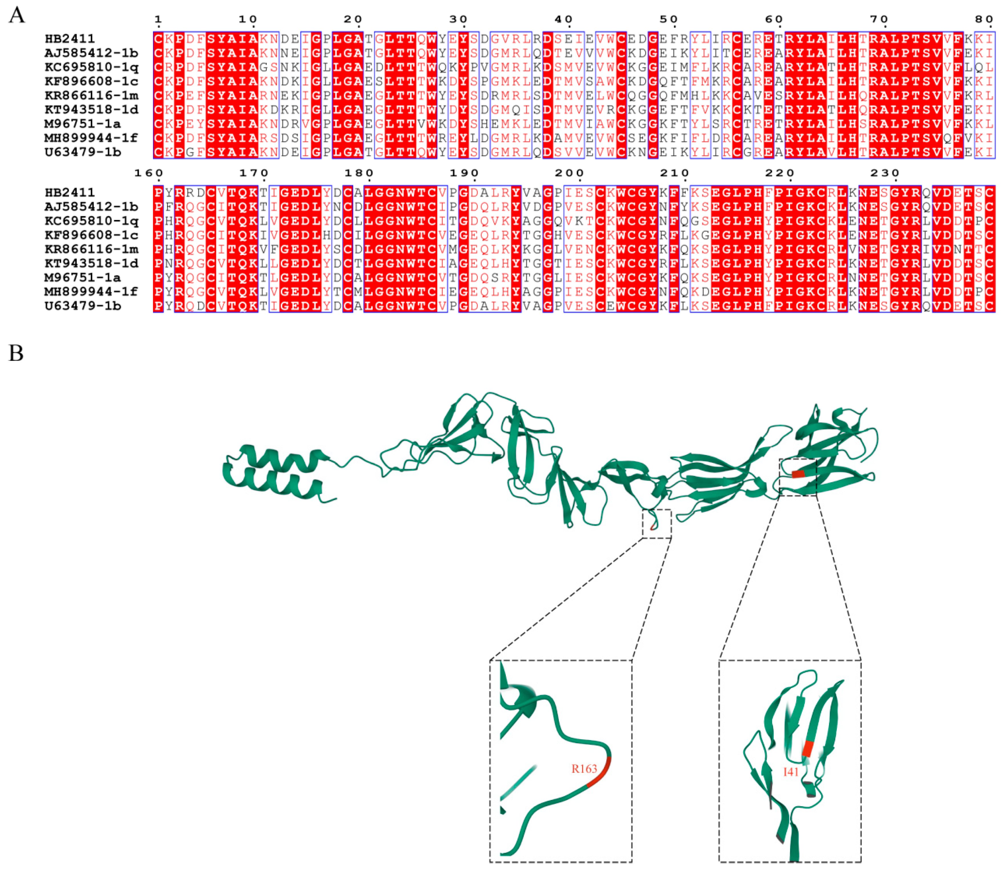 31]. E2 protein is the major surface protein of BVDV that is responsible for binding to host cell receptors and playing a crucial role related to virus entry into cells. In the newly isolated HB2411 strain, the E2 protein exhibits a mutation at position 163, where glutamine is substituted by arginine. The presence of positively charged arginine may significantly enhance the interaction between the virus and the negatively charged molecules, such as heparan sulfate proteoglycans (HSPG) on the host cell surface [