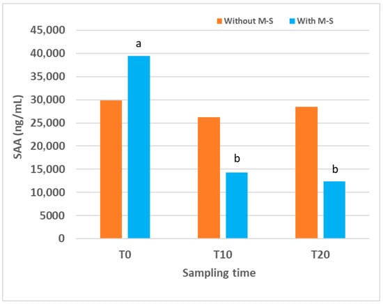 In the control group, SAA concentration at the beginning of this study was very high, 29,843 (16,205.50–111,879.62) ng/mL, and remained similar at all sampling times, with no significant differences detected over time. In the group of lambs treated with M-S, SAA concentration at T0 was also very high, 39,456 (30,996.17–105,669.65) ng/mL, but decreased after treatment. Values at T10 and T20 were significantly lower than that at T0 (p = 0.030 for both). When comparing the two groups, no significant differences were detected at any sampling time. However, a trend towards lower values was observed in the M-S-treated group compared with controls at T10 (p = 0.061) and T20 (p = 0.081), and SAA levels were reduced by 45% and 56.75% at T10 and T20, respectively.