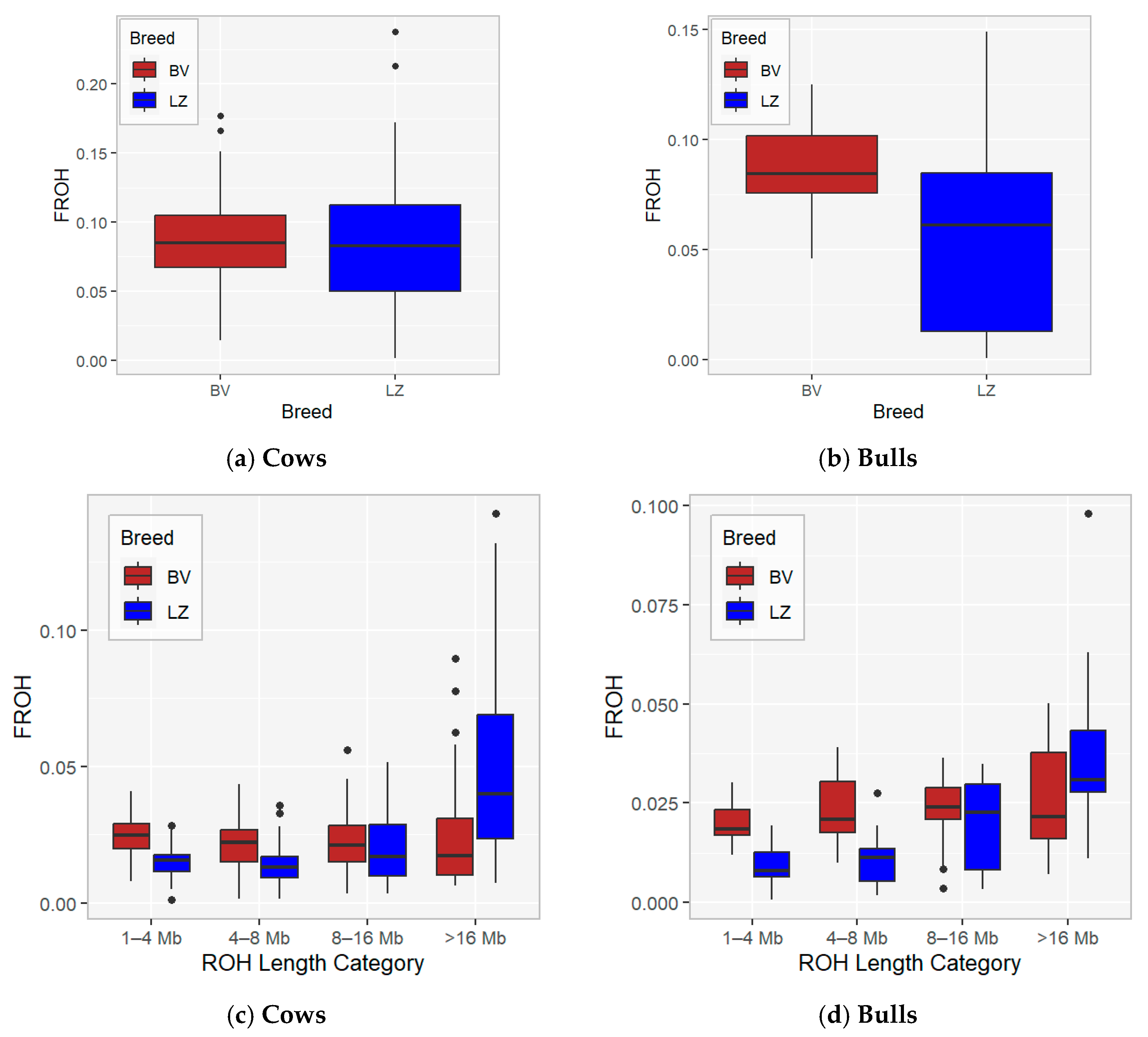 - Szmatoła, T.; Gurgul, A.; Jasielczuk, I.; Ząbek, T.; Ropka-Molik, K.; Litwińczuk, Z.; Bugno-Poniewierska, M. A Comprehensive Analysis of Runs of Homozygosity of Eleven Cattle Breeds Representing Different Production Types. Animals 2019, 9, 1024. [Google Scholar] [CrossRef]