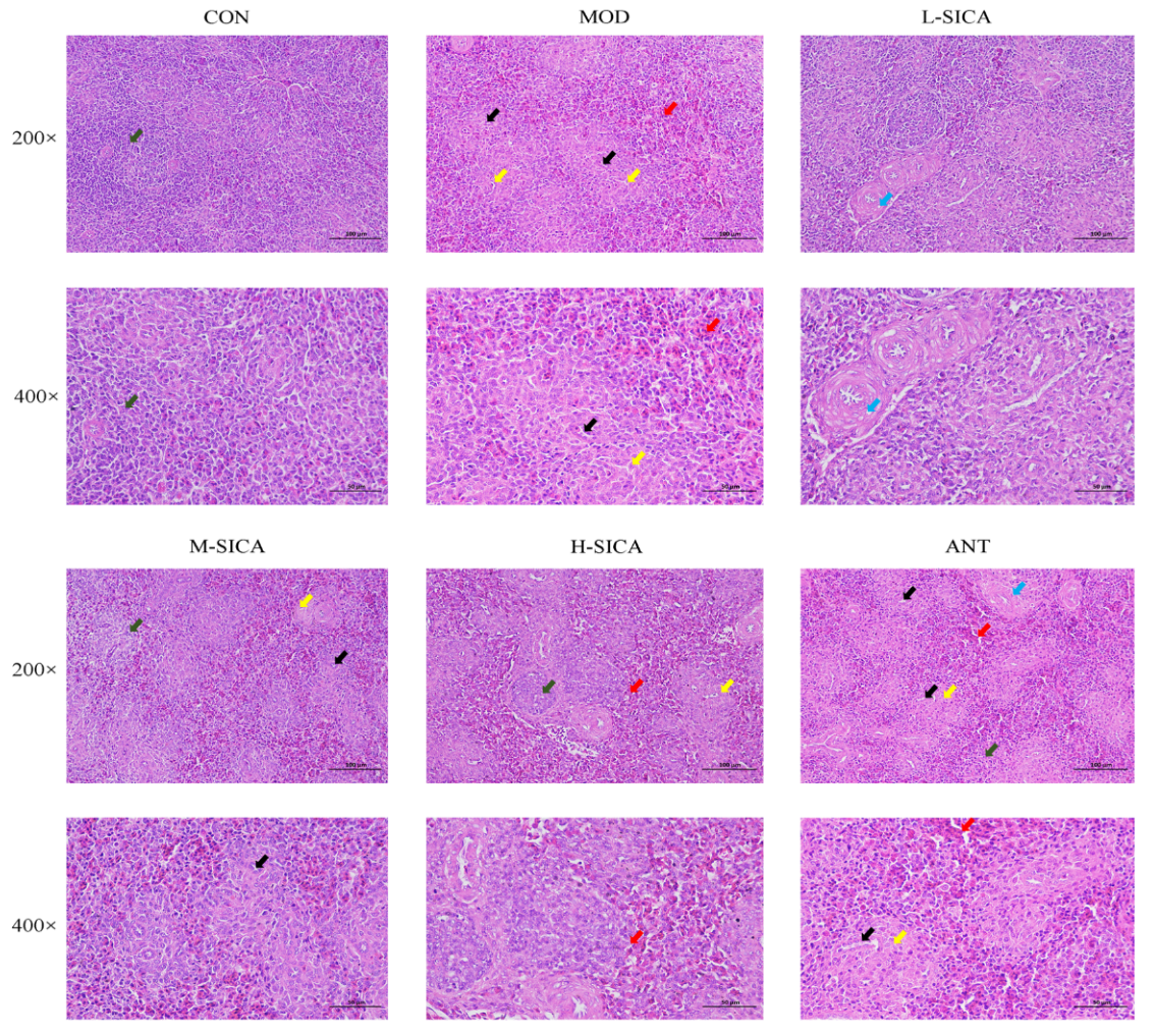 Notably, compared with the MOD group, the histological examination of the spleen in the SICA treatment group showed recovery, with reduced damage to the white pulp area and congestion of the red pulp, a clearer boundary between the white pulp and red pulp, and a tendency towards development of a normal architecture. The number of lymphocytes and the amount of connective tissue significantly increased, and small blood vessel proliferation was observed in a small area. The M-SICA and H-SICA groups showed significantly better results than the L-SICA group. In addition, compared to ANT, SICA treatment showed better improvement in the injured spleen.
