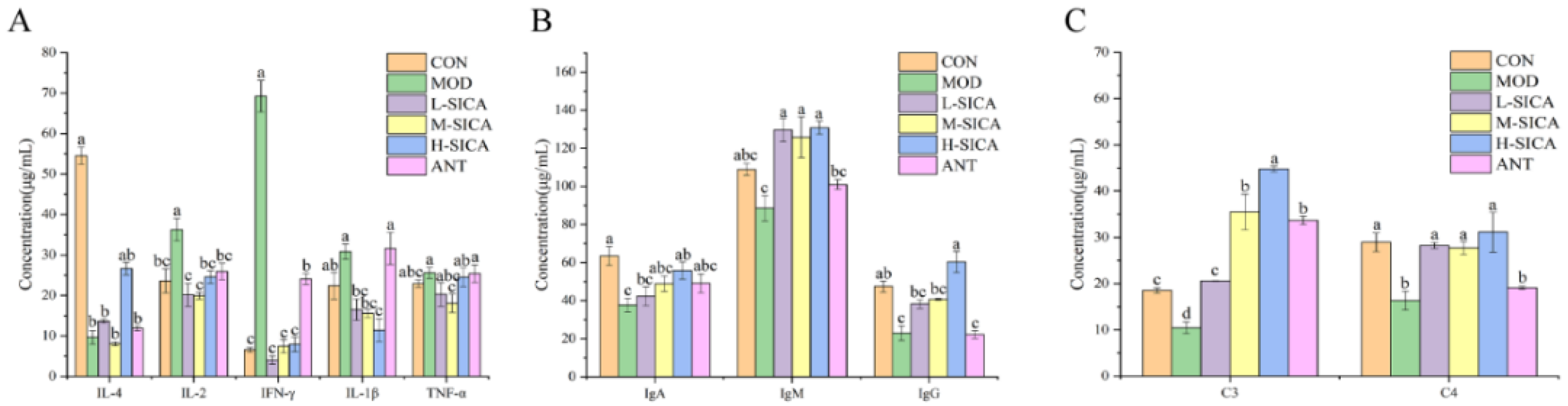 Figure 3. The effect of SICA on immune factors (n = 6). (A) The expression levels of inflammatory factors (IL-4, IL-2, IFN-γ, IL-1β, and TNF-α), (B) The expression level of immunoglobulins (IgA, IgM, and IgG), and (C) The expression levels of complement (C3 and C4 contents). Different lowercase letters (a, b, c, or d) were marked on the error lines indicating significant differences (p < 0.05).