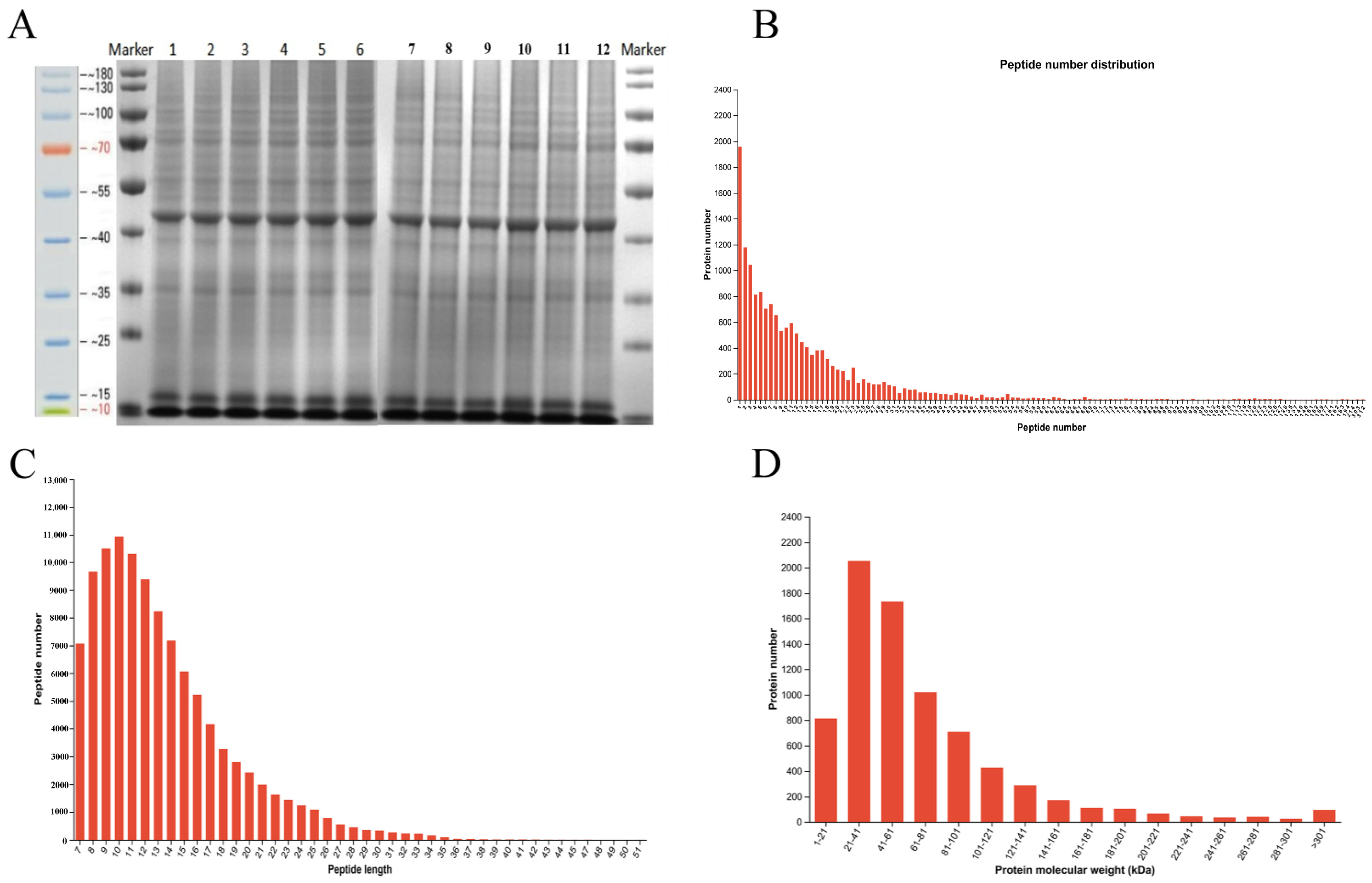 Figure 4. Basic information for iTRAQ identification of peptides and proteins. (A) SDS-PAGE image of spleen proteins, (B) Distribution of protein identifications by peptide number, (C) Distribution of peptide lengths, and (D) Distribution of protein molecular weights.