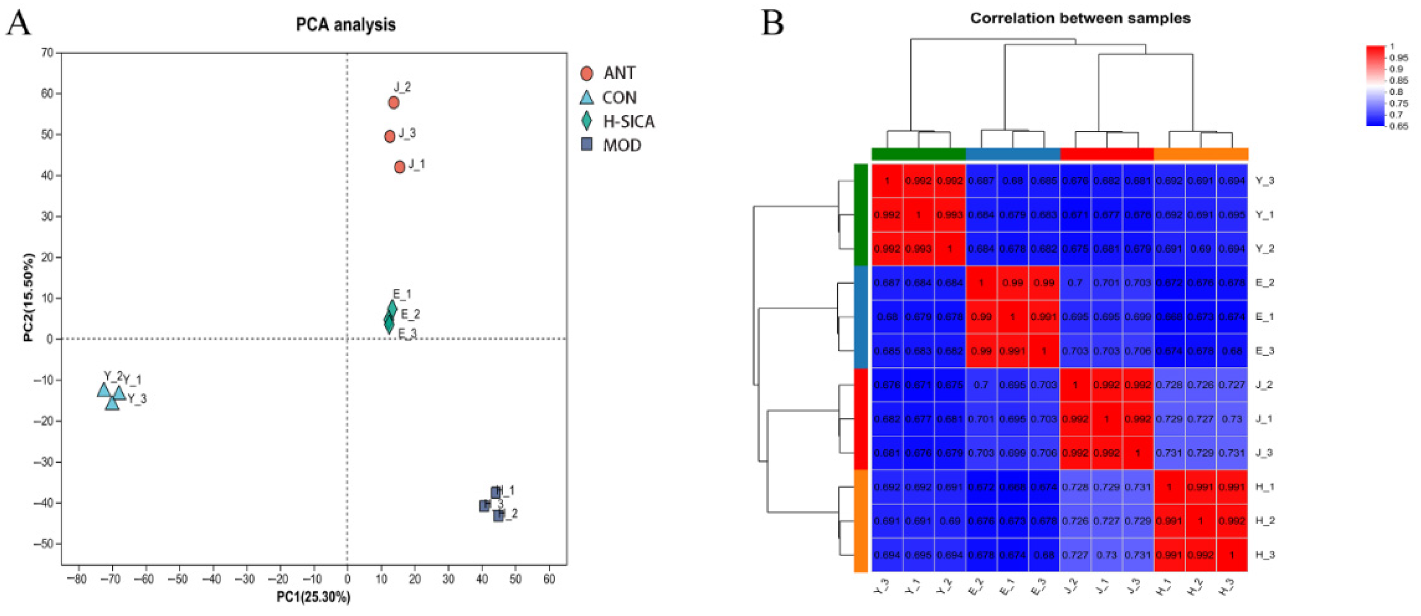 The PCA and correlation results are shown in Figure 5. The PCA indicated that samples within each treatment group clustered closely together, demonstrating satisfactory reproducibility. Samples from different treatment groups were clearly separated, showing distinct inter-group differences and strong treatment specificity among the CON, MOD, H-SICA, and ANT groups (Figure 5A). To further evaluate experimental reliability, correlations of protein expression levels between samples were calculated using Pearson’s correlation coefficient (r). As shown in Figure 5B, red grids indicate strong intra-group correlations (r > 0.99), whereas blue grids reflect weak inter-group correlations, confirming high intra-group similarity and significant inter-group differences among the CON, MOD, H-SICA, and ANT groups.