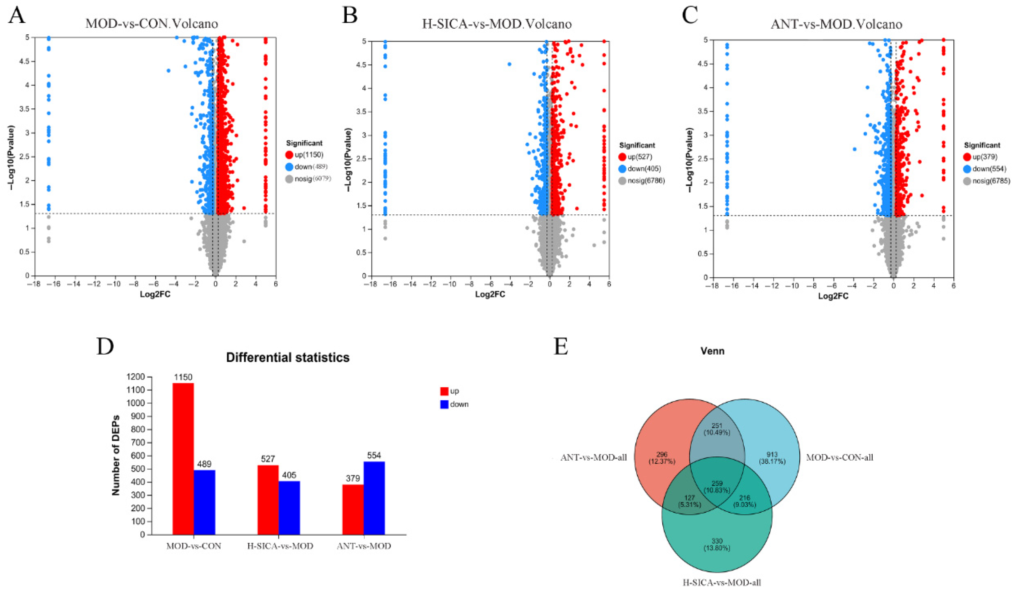 Figure 6. Inter-group DEPs volcano plots of the spleen tissue. (A) The DEP volcano diagram of the MOD group compared with the CON group, (B) The DEP volcano diagram of the H-SICA group compared with the MOD group, (C) The DEP volcano diagram of the ANT group compared with the MOD group, (D) The statistical histogram of inter-group DEPs, and (E) The Venn diagram of inter-group DEPs.