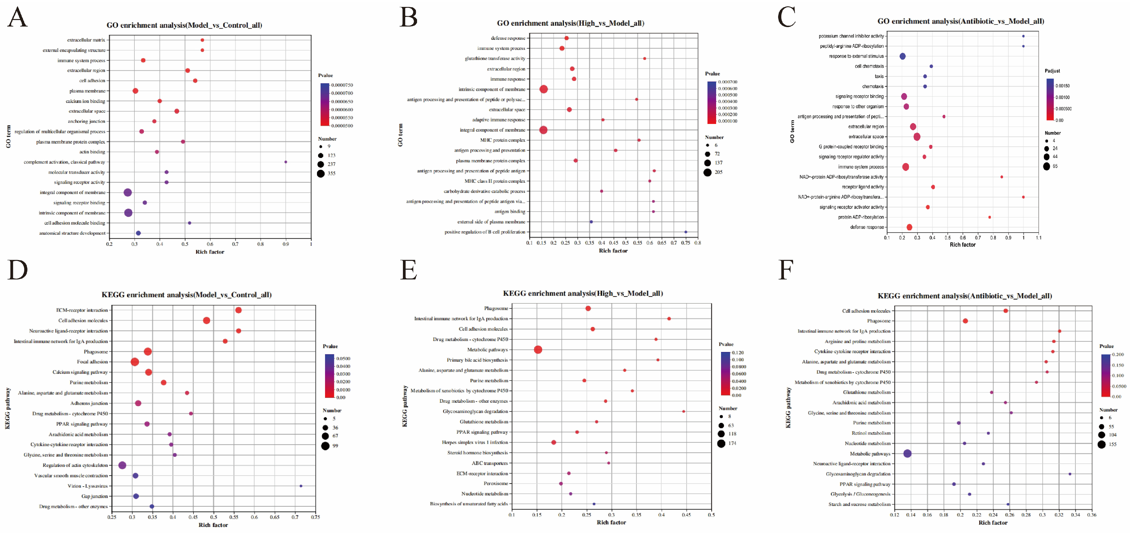 Figure 7. GO and KEGG enrichment analysis. (A) The GO enrichment results of MOD compared with CON, (B) The GO enrichment results of H-SICA compared with MOD, (C) The GO enrichment results of ANT compared with MOD, (D) The KEGG enrichment results of MOD compared with CON, (E) The KEGG enrichment results of H-SICA compared with MOD, and (F) The KEGG enrichment results of ANT compared with MOD.