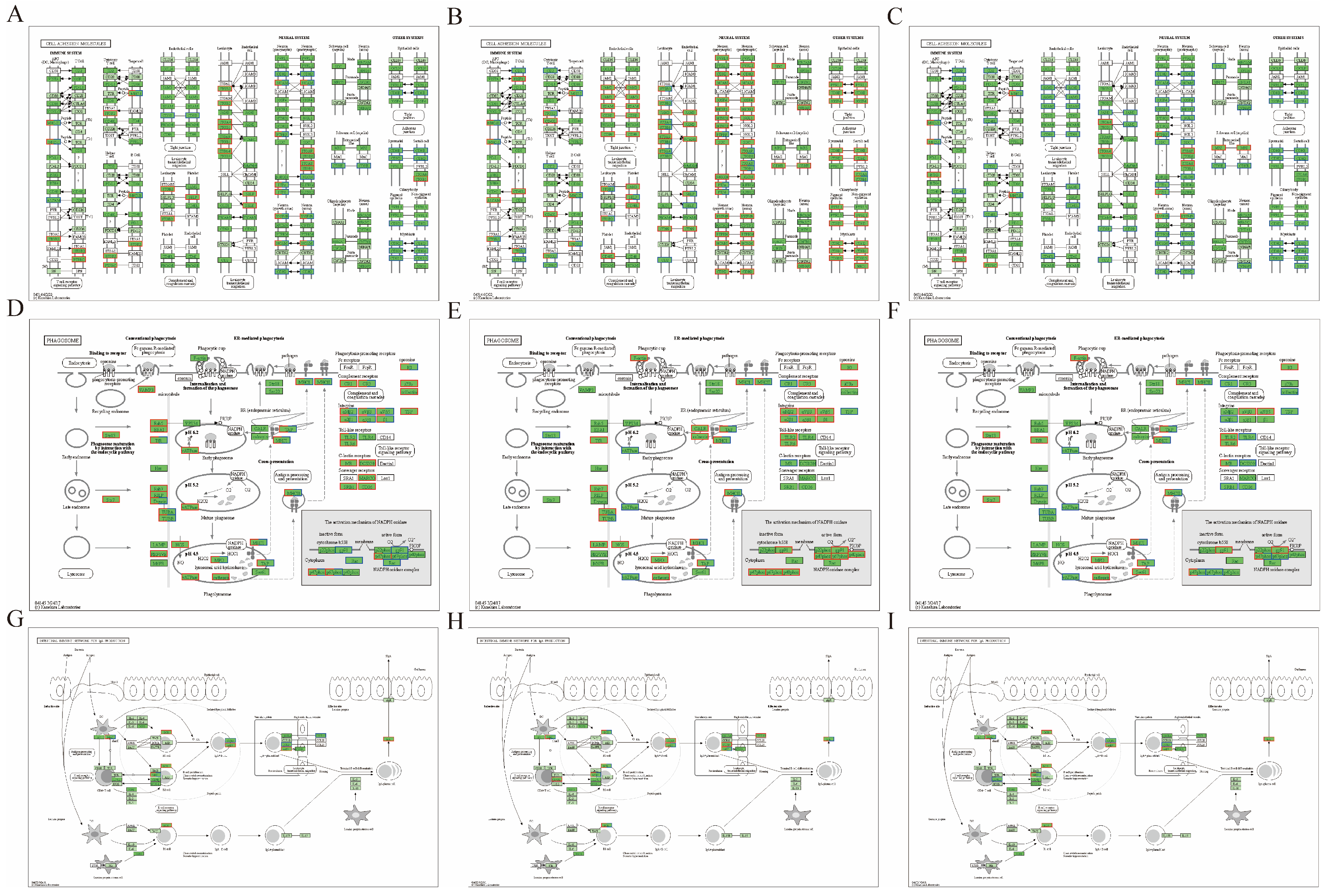 Figure 8. Protein expression results. (A) The protein expression result of MOD compared with CON in the cell adhesion molecule pathway, (B) The protein expression result of H-SICA compared with MOD in the cell adhesion molecule pathway, (C) The protein expression result of ANT compared with MOD in the cell adhesion molecule pathway, (D) The protein expression result of MOD compared with CON in the phagocytic pathway, (E) The protein expression result of H-SICA compared with MOD in the phagocytic pathway, (F) The protein expression result of ANT compared with MOD in the phagocytic pathway, (G) The protein expression result of MOD compared with CON in the intestinal immune network for IgA production pathway, (H) The protein expression result of H-SICA compared with MOD in the intestinal immune network for IgA production pathway, and (I) The protein expression result of ANT compared with MOD in the intestinal immune network for IgA production pathway.