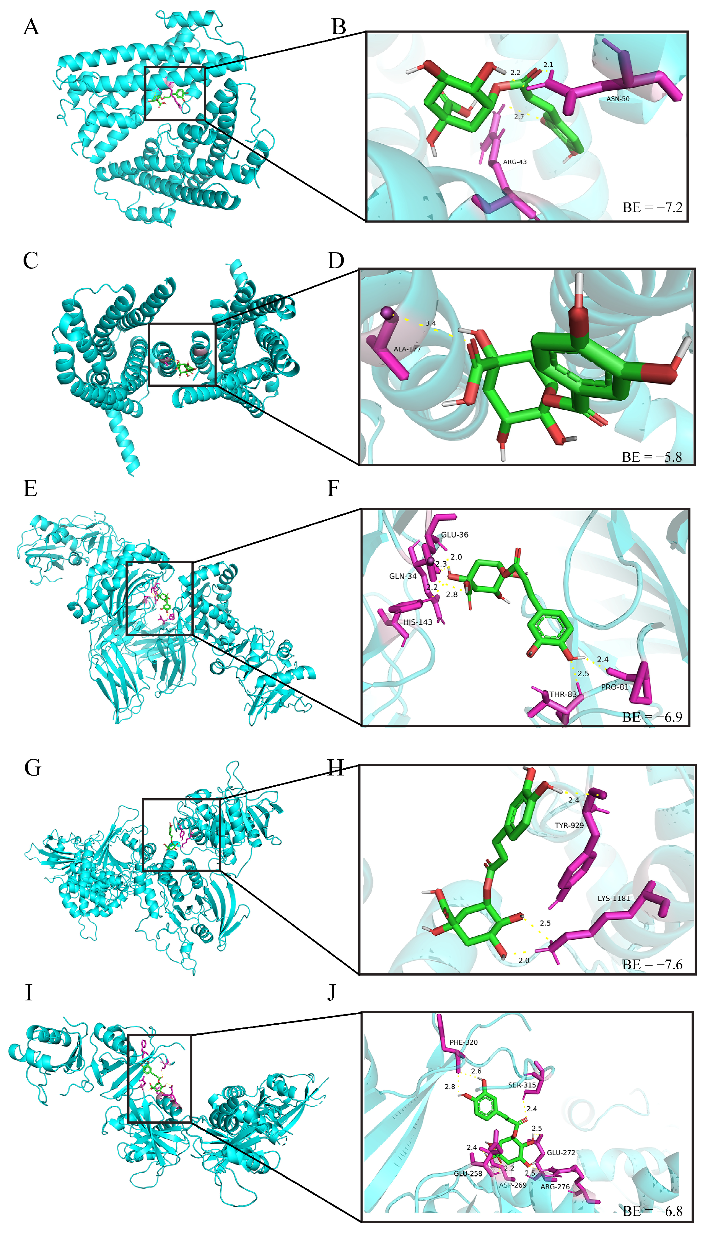 Figure 10. Molecular docking simulation diagram of SICA and DEPs. (A,B) BCR protein, (C,D) CCR9 protein, (E,F) MHCII protein, (G,H) PTPRC protein, and (I,J) p67phox protein. Binding energy (kcal/mol) values between SICA and DEPs are indicated.