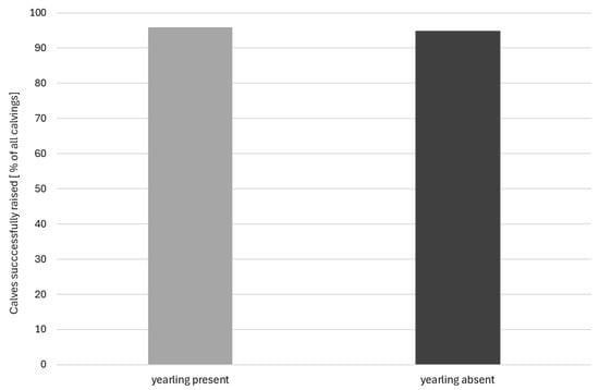 Raising success totalled over the six years was 95.9% for calves born with the yearling calf present and 94.7% for calves with the yearling calf absent, reaching one year of age (Figure 1). Each cow contributed at least two live-born calvings to the total number. A total of 1005 of these calves were born in the presence of a yearling (YP); of these, 964 were successfully raised by their mothers to one year old. A total of 817 calves were born without a yearling present (YA); of these, 774 were successfully raised.