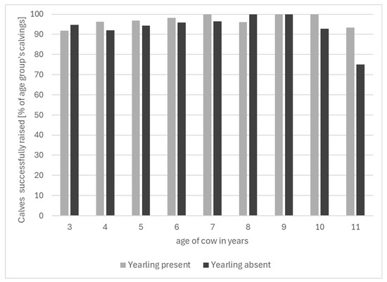 Raising success rates in this sample of cows were 96% success overall in the presence of the yearling and 95% without a yearling present. They varied from 90% to 100% in cow age cohorts up to 10 years old. Analysis of only one—her penultimate—calf per cow similarly did not reveal a negative impact of yearling presence on calf survival to 12 months old.