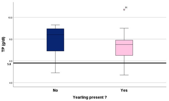 Distribution of serum total protein levels depending on the presence of the yearling. Yearling absent: n = 12, yearling present: n = 81. Given are medians and 1st and 3rd quartiles. The 5.8 g/dL line is the cut-off point for ‘good’ colostrum antibody uptake according to the classification for dairy calves by Lombard et al. [42].