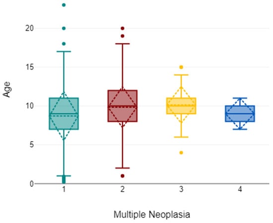 Age distribution according to tumour multiplicity (one to four lesions). Data are shown as boxplots displaying the median and interquartile range (IQR); whiskers represent the minimum and maximum values, with outliers plotted as individual points. Among dogs with age available (n = 3274/3528), median age increased from 9 years in animals with a single lesion to 10 years in those with two or three lesions, while the four-lesion group should be interpreted with caution given its very small size (n = 3). Age differences across multiplicity categories were statistically significant (χ2 = 85.31, df = 3, p < 0.001), with post hoc Dunn–Bonferroni tests confirming differences between one vs. two lesions and one vs. three lesions (adjusted p < 0.001 and p = 0.014, respectively).