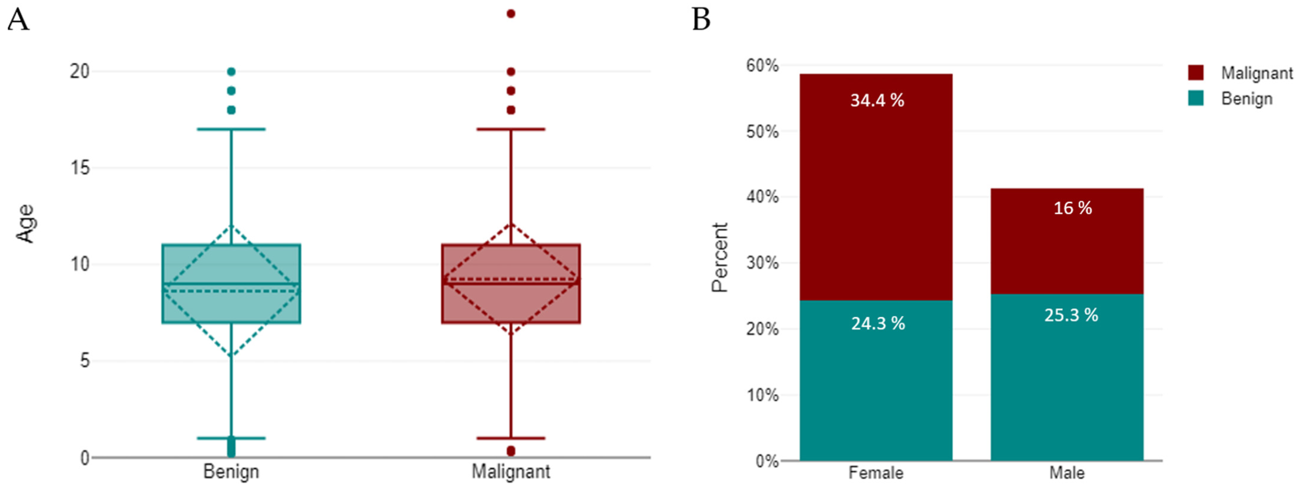 Distribution of benign and malignant tumours in dogs. Distribution of benign and malignant tumours in dogs. (A) Age distribution by tumour type, shown as boxplots indicating the median and interquartile range (IQR); whiskers denote minimum and maximum values, with outliers plotted individually. A significant difference was detected between benign and malignant groups (p < 0.001). (B) Sex distribution, illustrating the relative proportions of benign and malignant tumours in females and males.