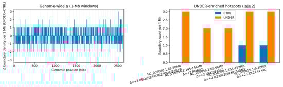 To localize remodeling, we profiled boundary density in 1 Mb sliding windows and contrasted groups (Δ = UNDER − CTRL) (Figure 3). Using a stringent threshold of |Δ| ≥ 2 boundaries/Mb, we detected 18 UNDER-enriched windows (17 overlapping annotated genes) and 38 CTRL-enriched windows (Table 3; Table S1). Although CTRL had more enriched windows overall—consistent with its larger set of group-specific boundaries—UNDER showed several salient, gene-proximal hotspots, including (Figure 4):