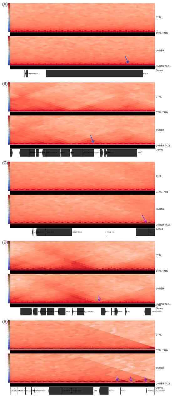 Representative hotspots showing localized remodeling of 3D genome organization in UNDER vs. CTRL animals. For each 1 Mb locus (A–E), the upper heatmaps show group-merged Hi-C contact maps at 40 kb resolution for CTRL and UNDER, and the tracks immediately below show the corresponding TAD calls. The bottom track shows the annotated genes in each region. Arrows mark TAD boundaries whose boundary strength is higher in UNDER than in CTRL. (A) Hotspot near ROBO2: a sharper boundary in UNDER (arrow) subdivides a larger CTRL domain and increases insulation close to ROBO2. (B) Hotspot near COL27A1: a stronger boundary in UNDER (arrow) splits the CTRL domain and delimits a smaller TAD containing COL27A1. (C) Hotspot near VRK2/FANCL: a strengthened boundary in UNDER (arrow) sharpens local insulation and partly isolates VRK2 from its upstream neighborhood. (D) Hotspot near the IL22/IL26/IFNG–MDM1 cytokine cluster: a stronger flanking boundary in UNDER (arrow) enhances insulation around this immune-related gene cluster. (E) Hotspot near FOXR2–MAGEH1: stronger boundaries in UNDER (arrows) segment the contact domain more strongly than in CTRL, indicating increased insulation flanking FOXR2 and MAGEH1.