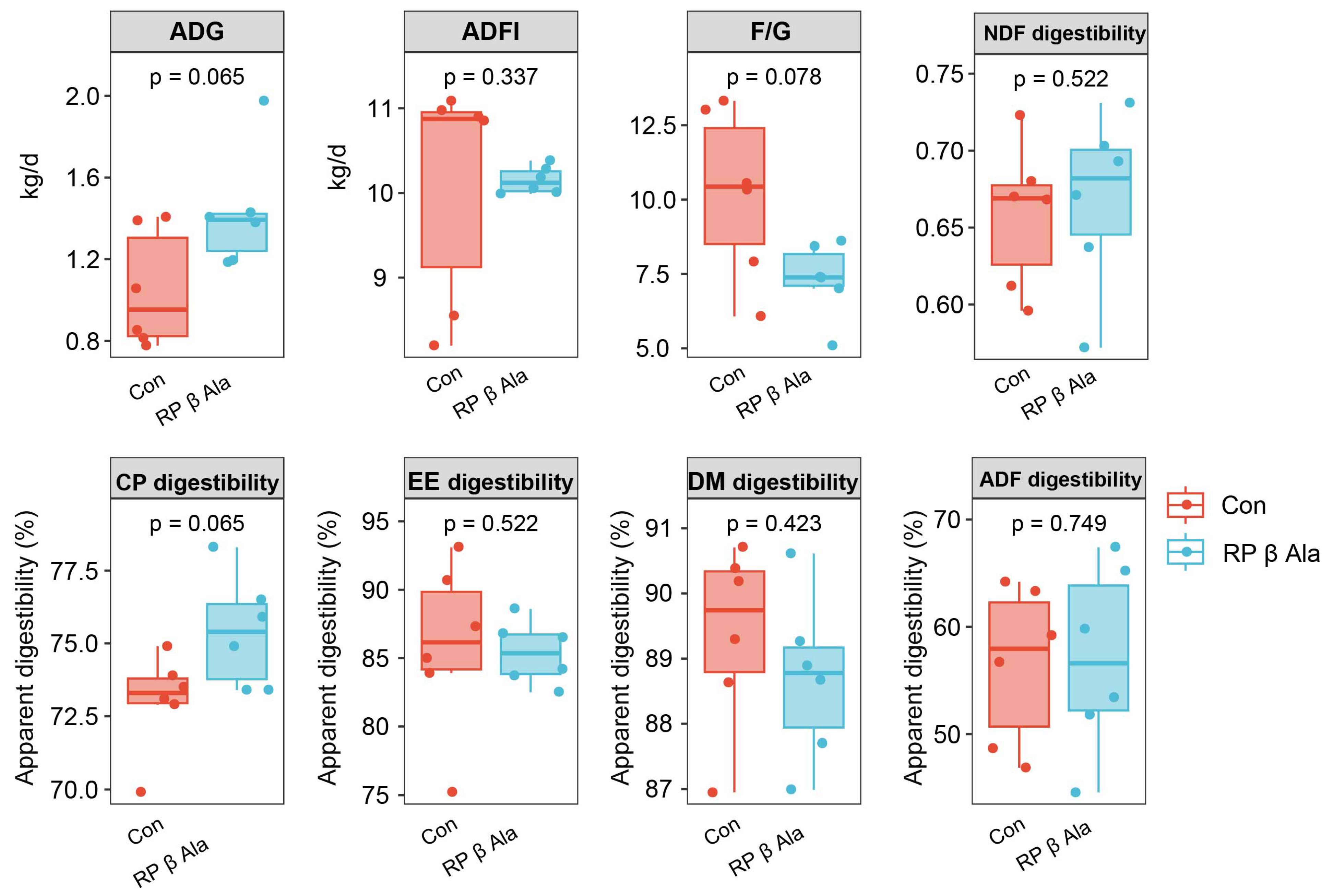 4.1. Effect of Supplementary Rumen-Protected β-Ala on Growth Performance and Feed Conversion in Beef Cattle