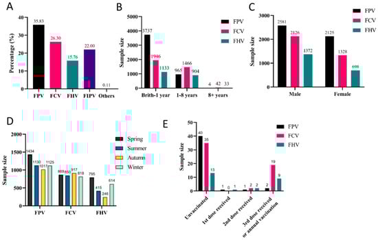 Prevalence of major feline viral infections: (A) Overall detection rates. (B) Age distribution. (C) Sex-associated differences. (D) Seasonal distribution. (E) Vaccination status.