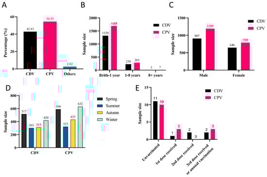 Prevalence of major canine viral infections: (A) Overall detection rates. (B) Age distribution. (C) Sex-associated differences. (D) Seasonal distribution. (E) Vaccination status.