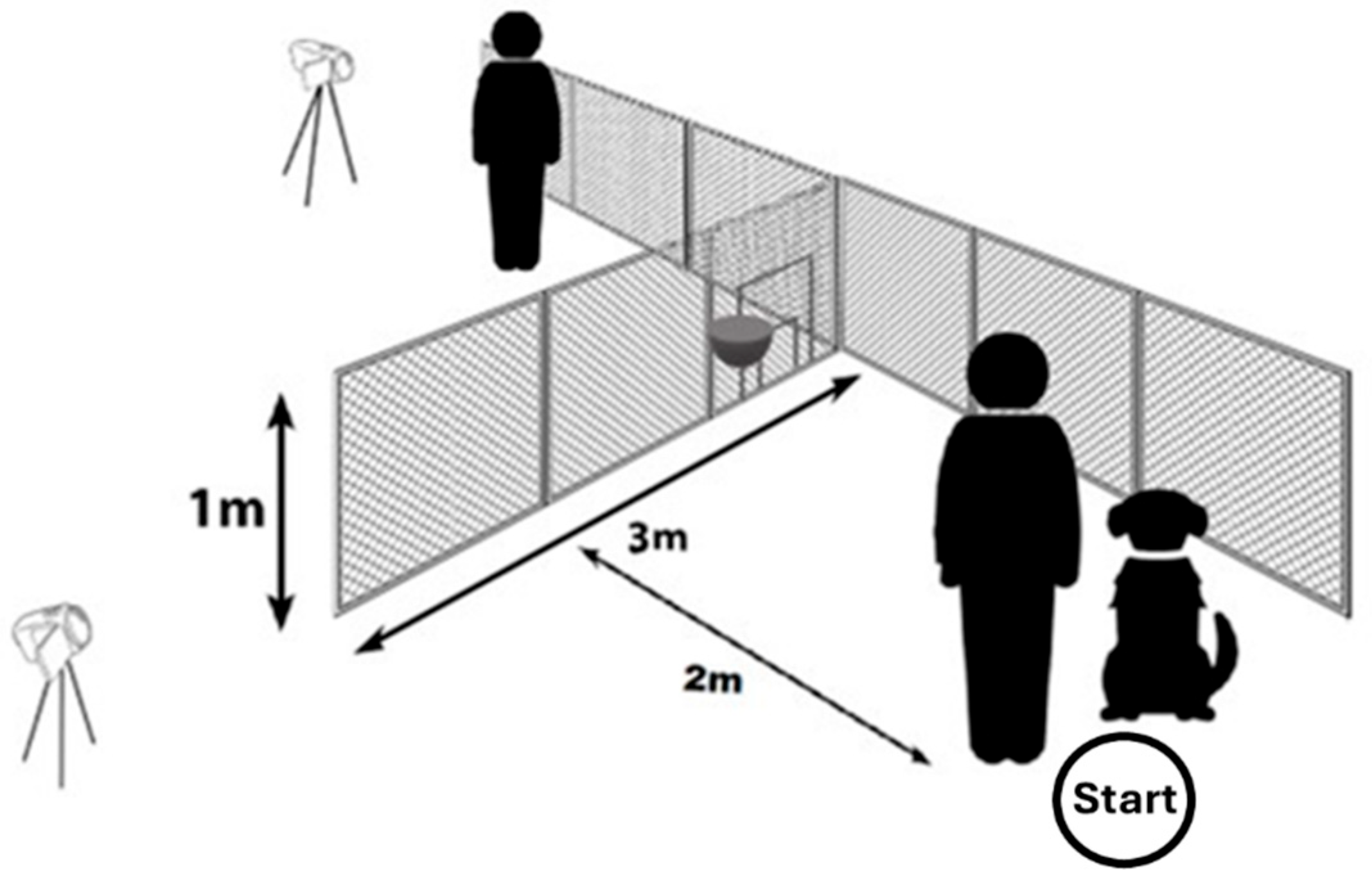 Figure 1). When we set up this device, we attached one end to a tall chain link fence at the property border (the two fences met in a 90° angle). Dogs could not go around the property border fence because it was approximately 200 m long. It was also not possible for the subjects to dig under our device because of the steel frame. We used two digital cameras (Blow GoPro (San Mateo, CA, USA) and Panasonic (Kadoma, Japan)) on tripods to record each test for later behavioural analysis.